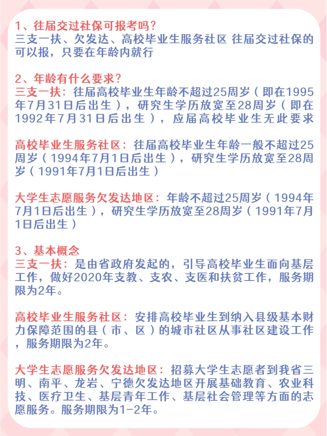 三支一扶∶往届高校毕业生年龄不超过25周岁(即在1995 年7月31日后出生),研究生学历放宽至28周岁(即在1992年7月31日后出生),应届高校毕业生无此要求