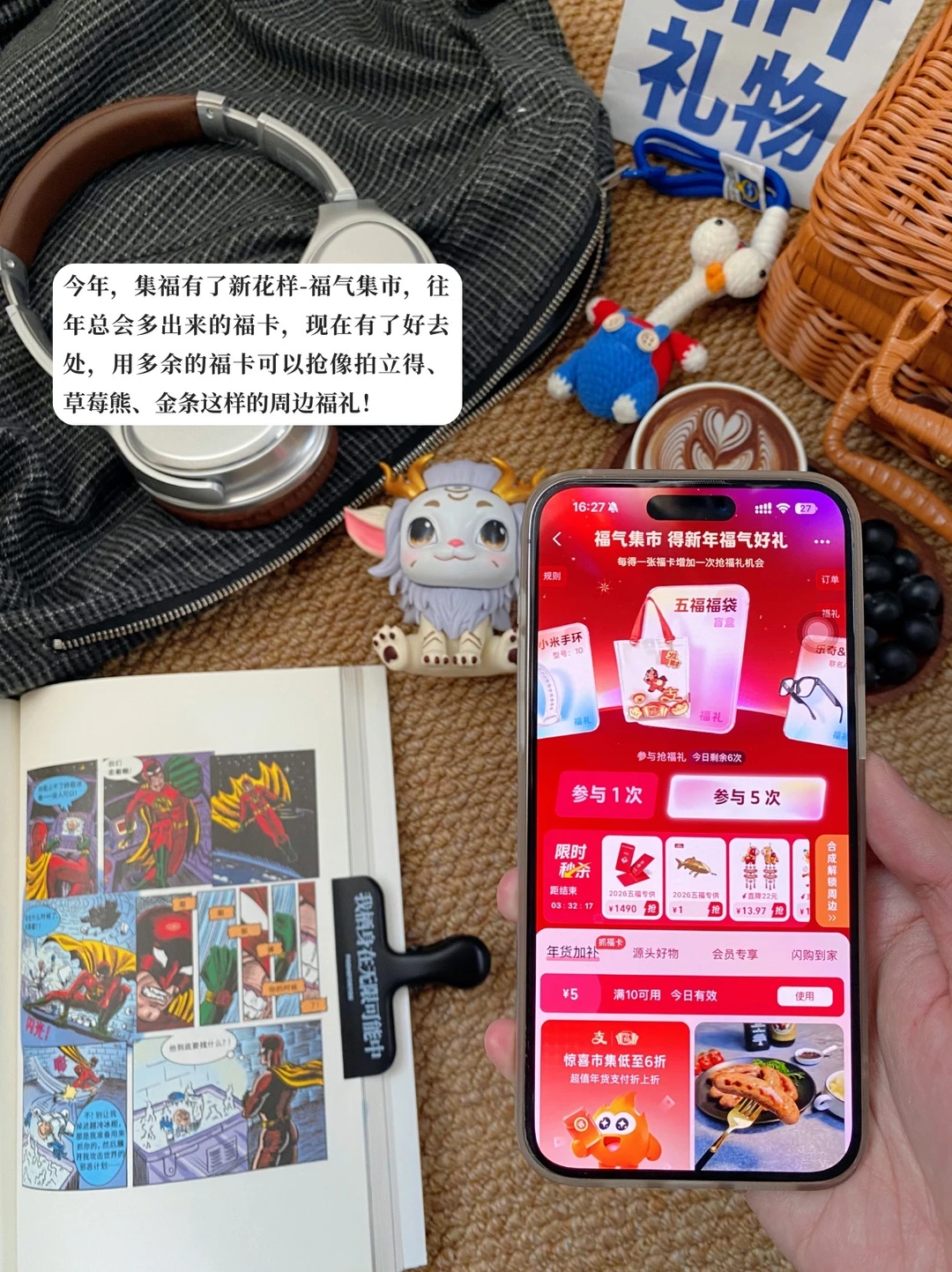 每年和父母一起在支付宝上集福已经成了我家辞旧迎新的必备仪式!今年,集福有了新花样-福气集市,往年总会多出来的福卡,现在有了好去处,每得一张福卡都可以参与抢好礼!有拍立得、草莓熊、金条之类的周边福礼!为了拿到红包之外的更多礼物,我总结出几个小tips,核心就是多集福卡!!