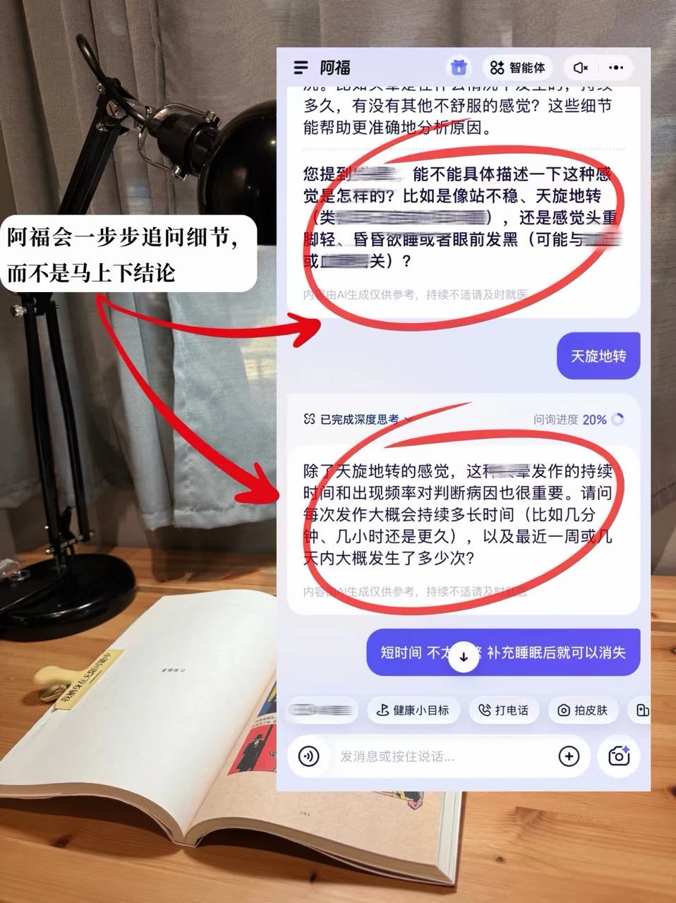 不少 AI 都是套话模板来回用,但阿福是真的有懂🧑⚕️的逻辑!之前连续加班后突然头晕(其实是睡眠不足),就随手问了问它。它没有武断地下结论,而是有来有回地一步步追问细节:“您有昏昏欲睡吗?或者眼前发黑?”