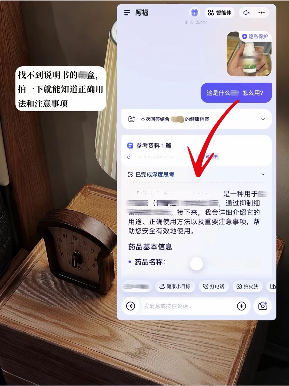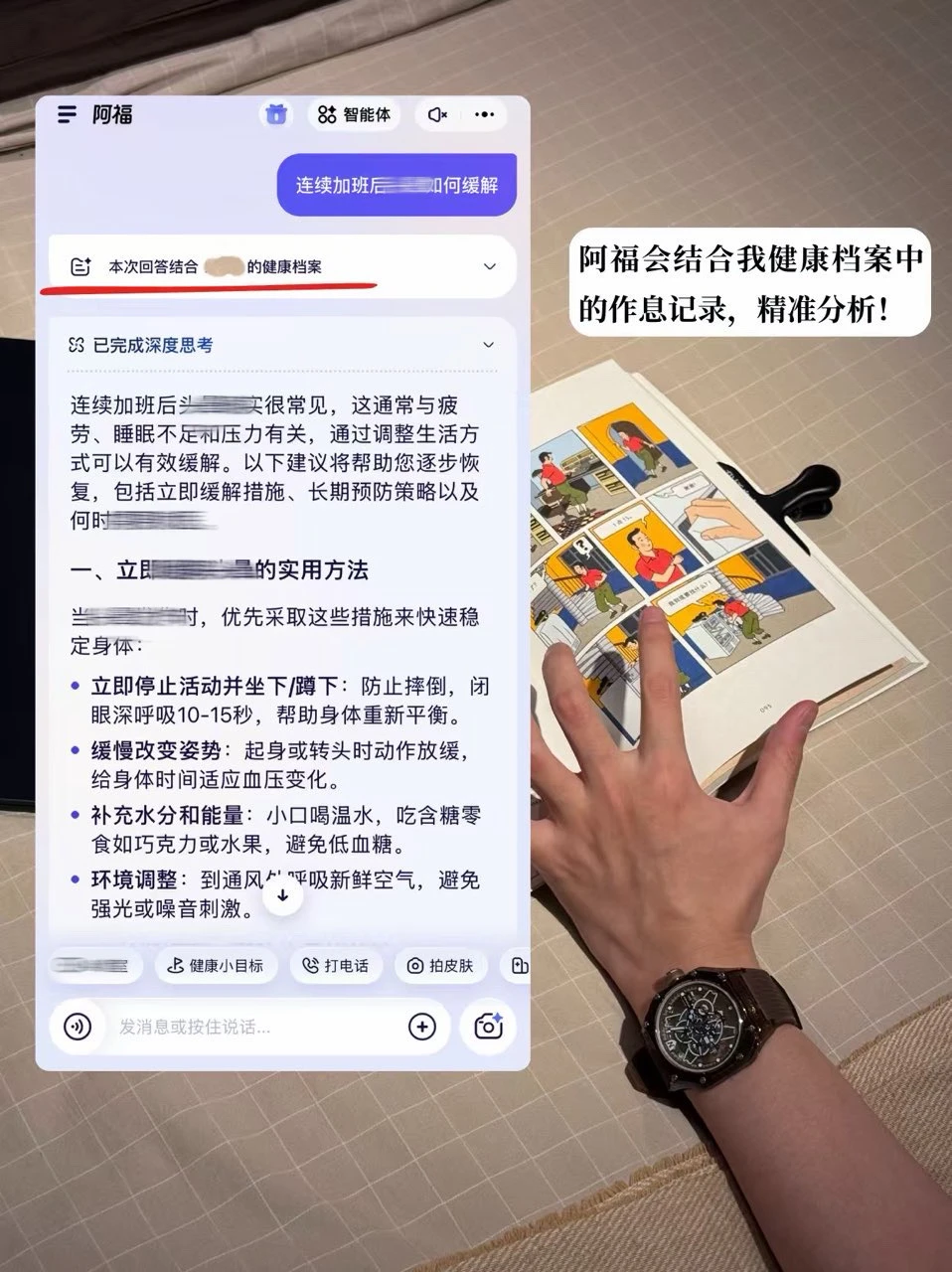 阿福还会结合我健康档案里的作息记录,提醒我可能是睡眠不足导致的。这种精准追问的模式,能理清症状的关键信息,给出的建议议特别特别有针对性、特别踏实❤️