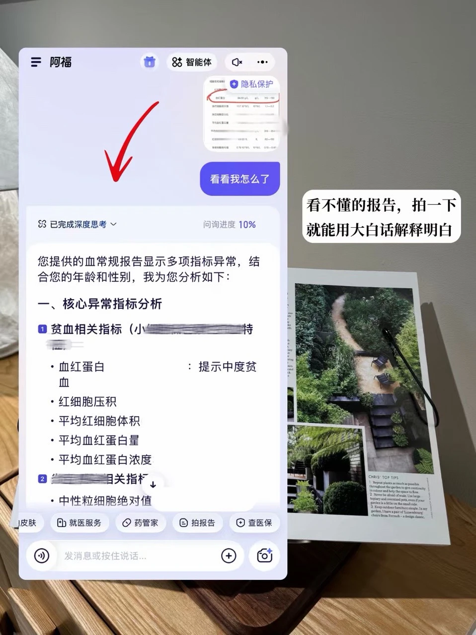 这个功能我能安利一万遍! 以前体检报告单看着天书一样,怕出问题又没空跑🏥。用阿福拍一下报告,它会先把这些核心异常指标用大白话讲清楚,还能对比多年报告进行分析!家里已经放积灰的各种💊,分不清拍下就能知道正确用法和注意事项,再也不用到处找说明书了✨