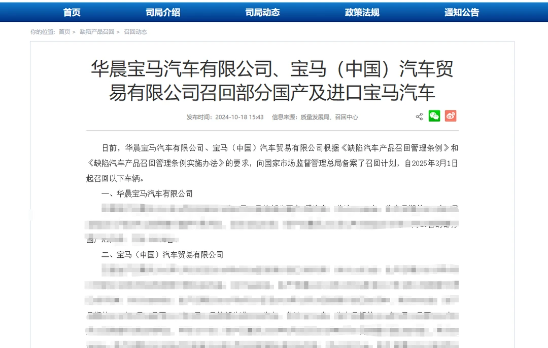 宝马于2024年10月18日在国家市场监督总局网站发布召回通知,对存在问题的电动冷却液泵插头进行召回升级。