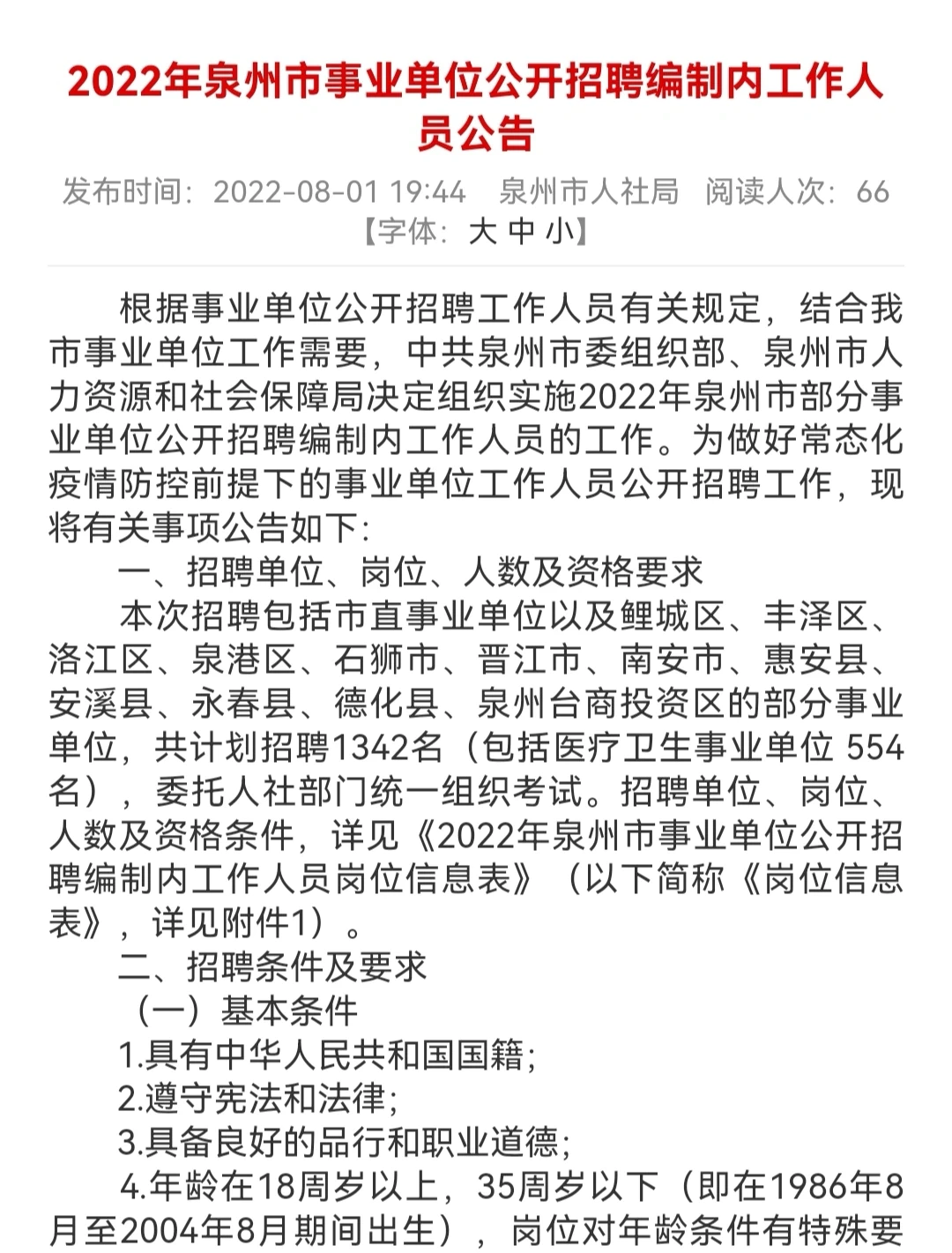 泉州事业单位公告发布!招录1342人!报名时间2022年8月3日8:00至8月7日17:30
