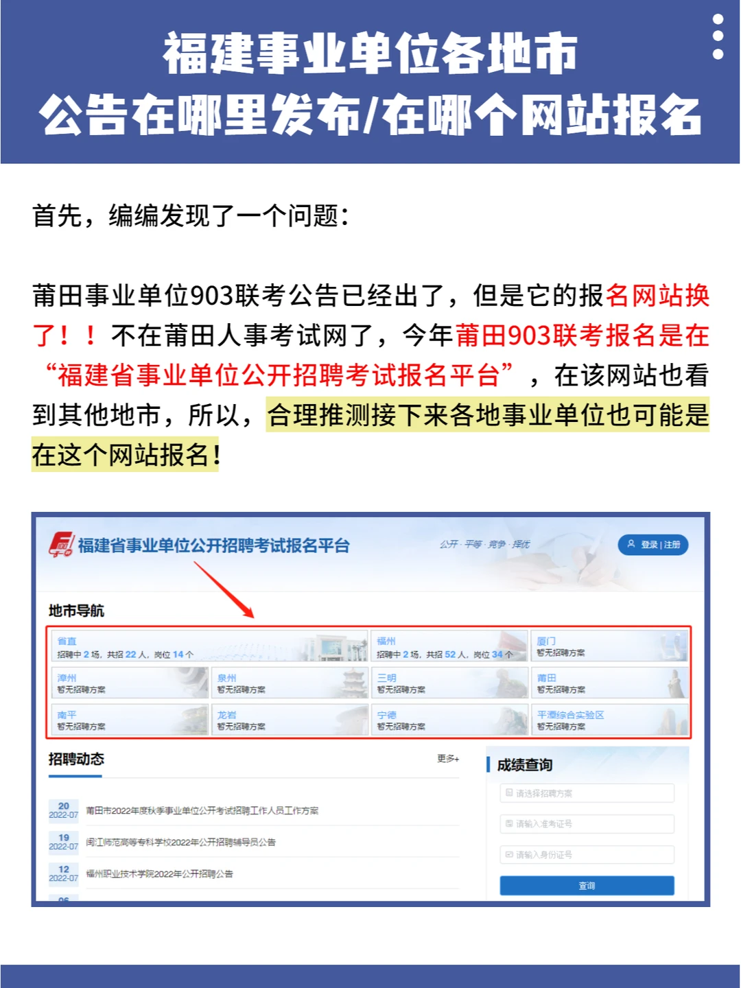 ⚠⚠首先,编编发现了一个问题: 莆田事业单位903联考公告已经出了,但是它的报名网站换了!!不在莆田人事考试网了,今年莆田903联考报名是在“福建省事业单位公开招聘考试报名平台”,在该网站也看到了其他地市入口,所以,合理推测接下来各地事业单位也将是在这个网站报名!