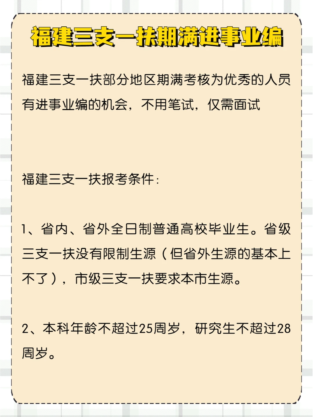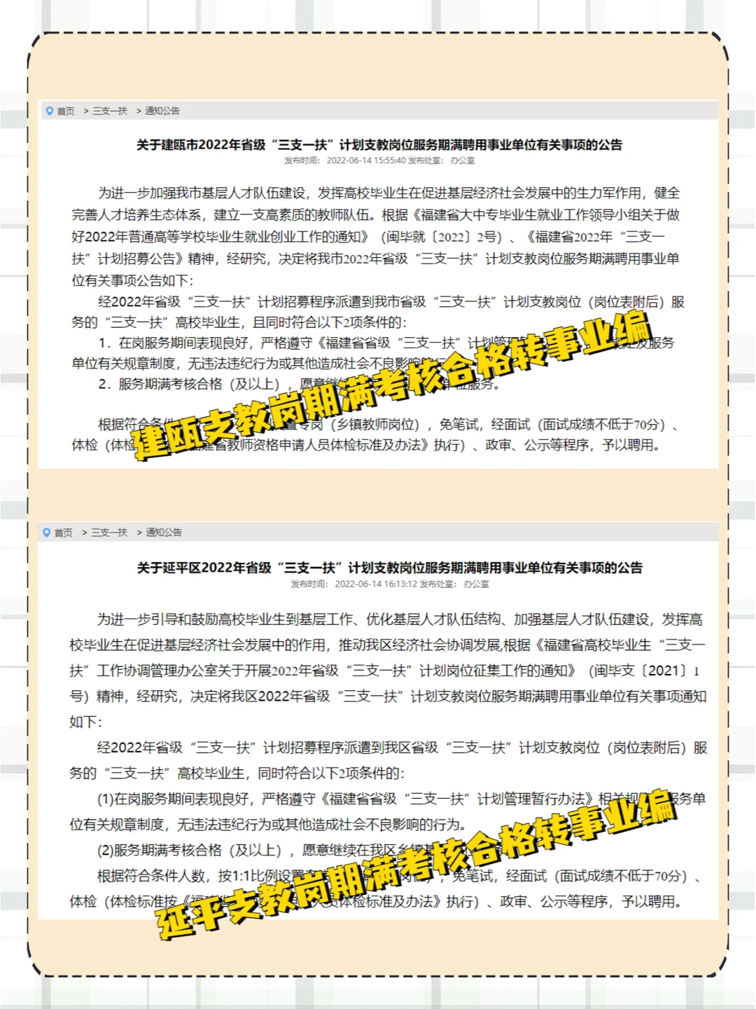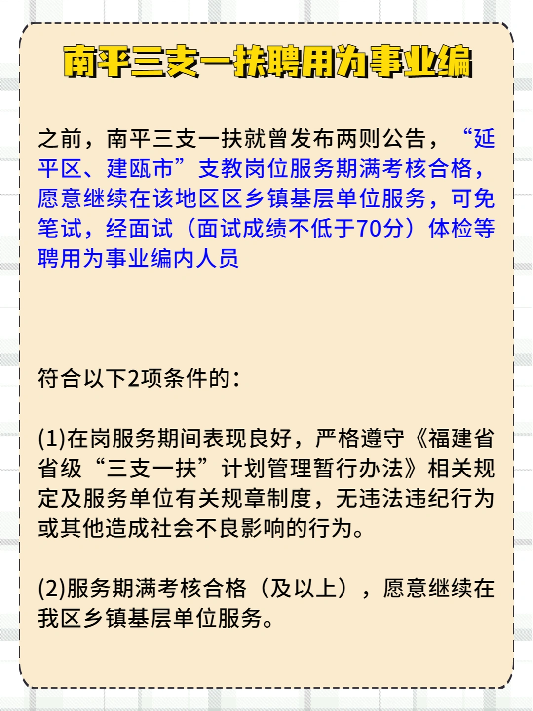 🎈之前,南平三支一扶就曾发布两则公告,“延平区、建瓯市”支教岗位服务期满考核合格,愿意继续在该地区区乡镇基层单位服务,可免笔试,经面试(面试成绩不低于70分)体.检等聘用为事业编内人员
