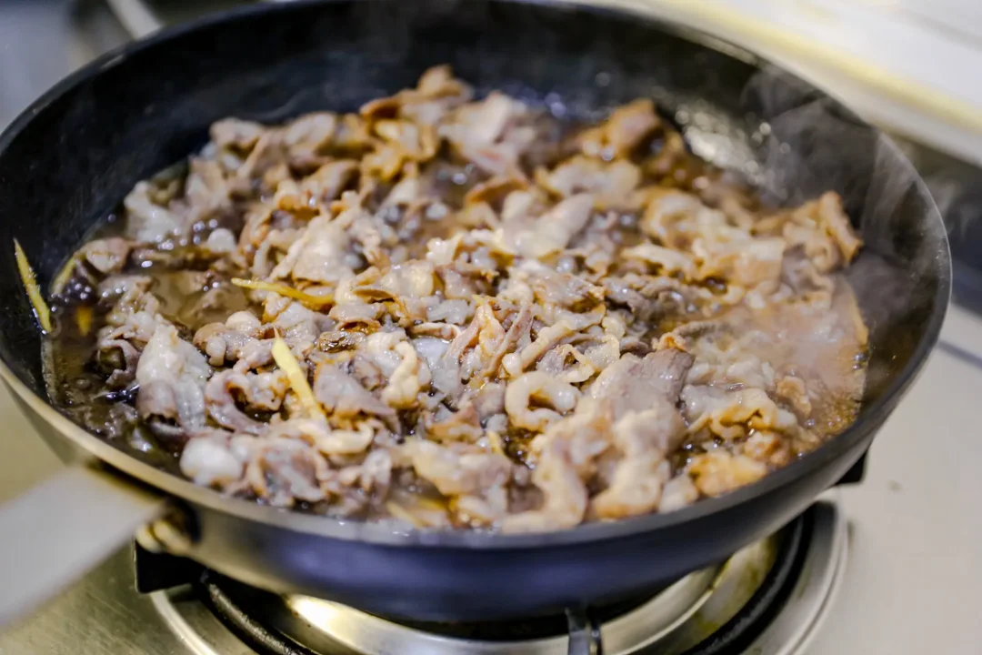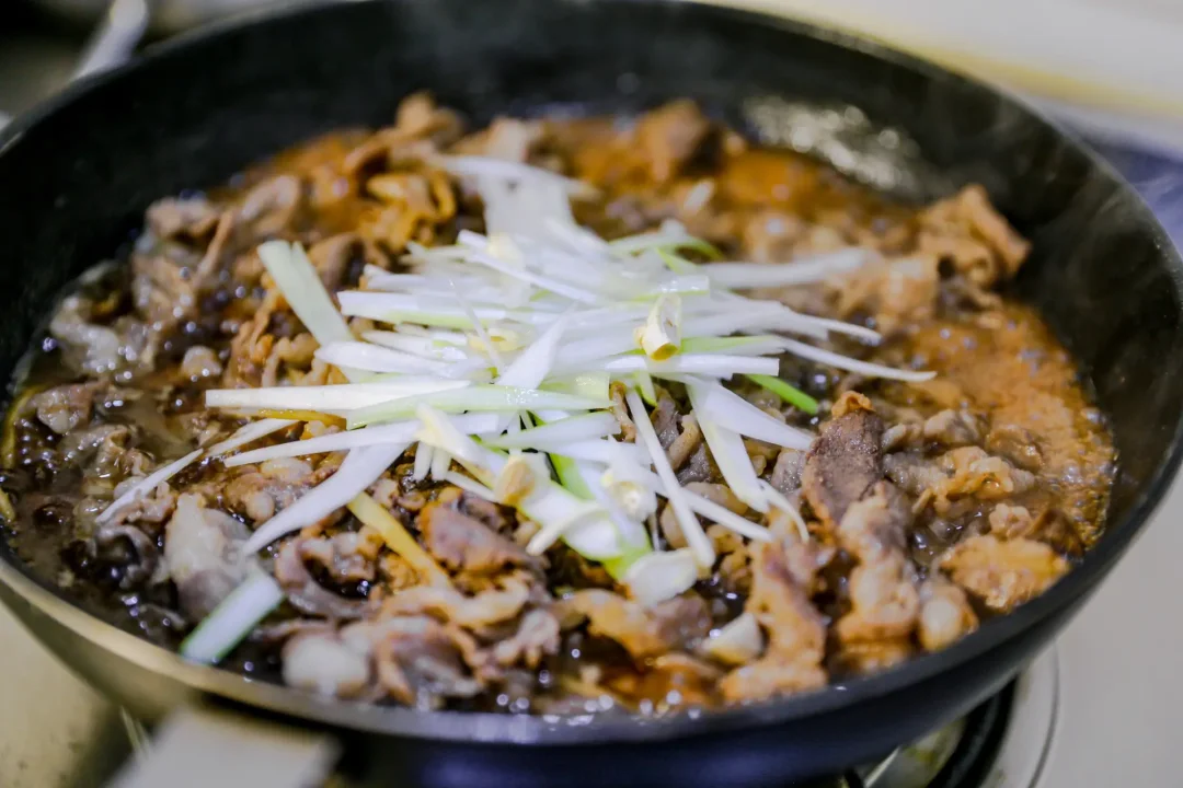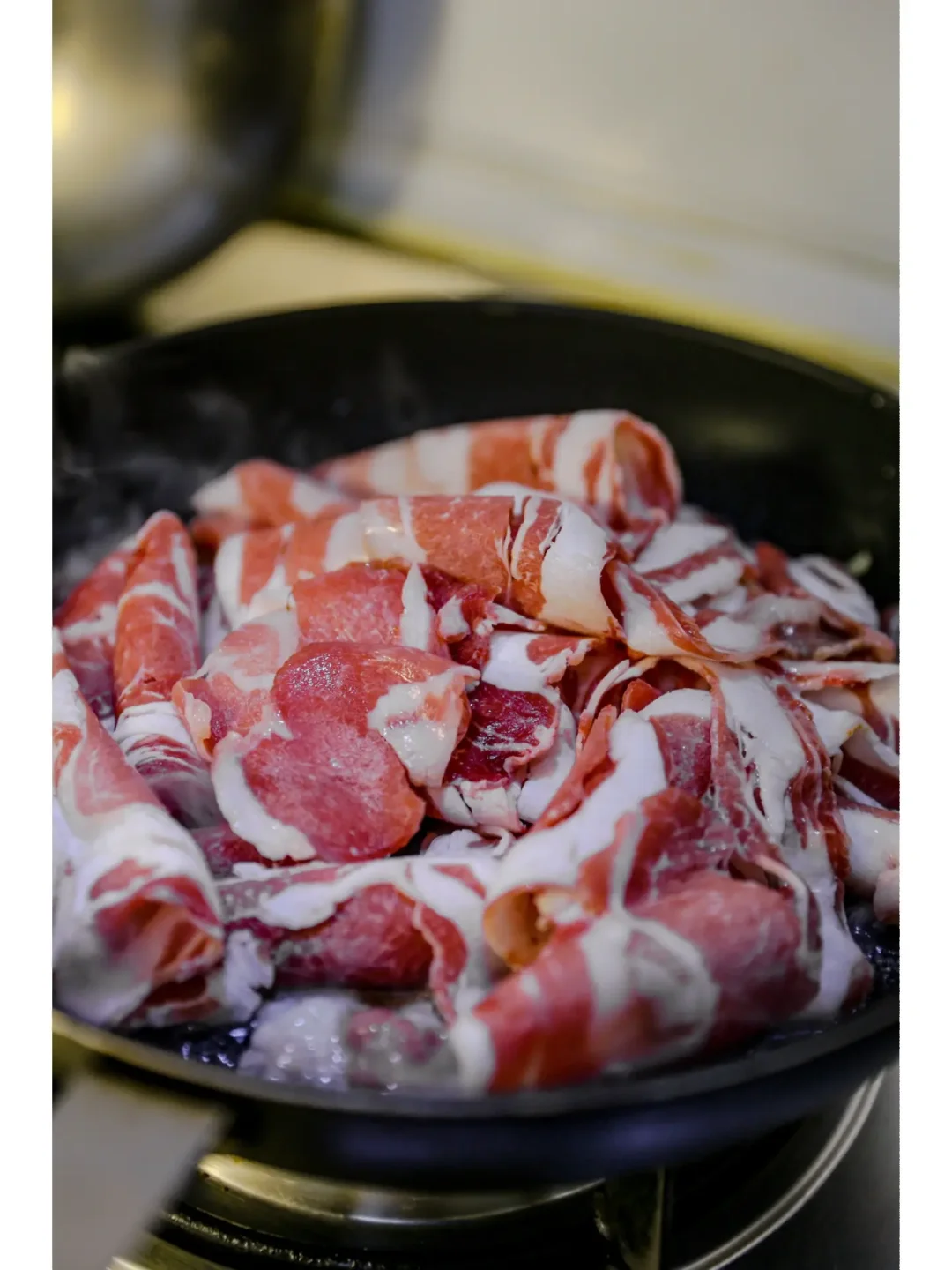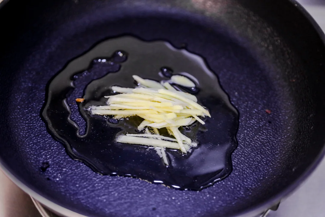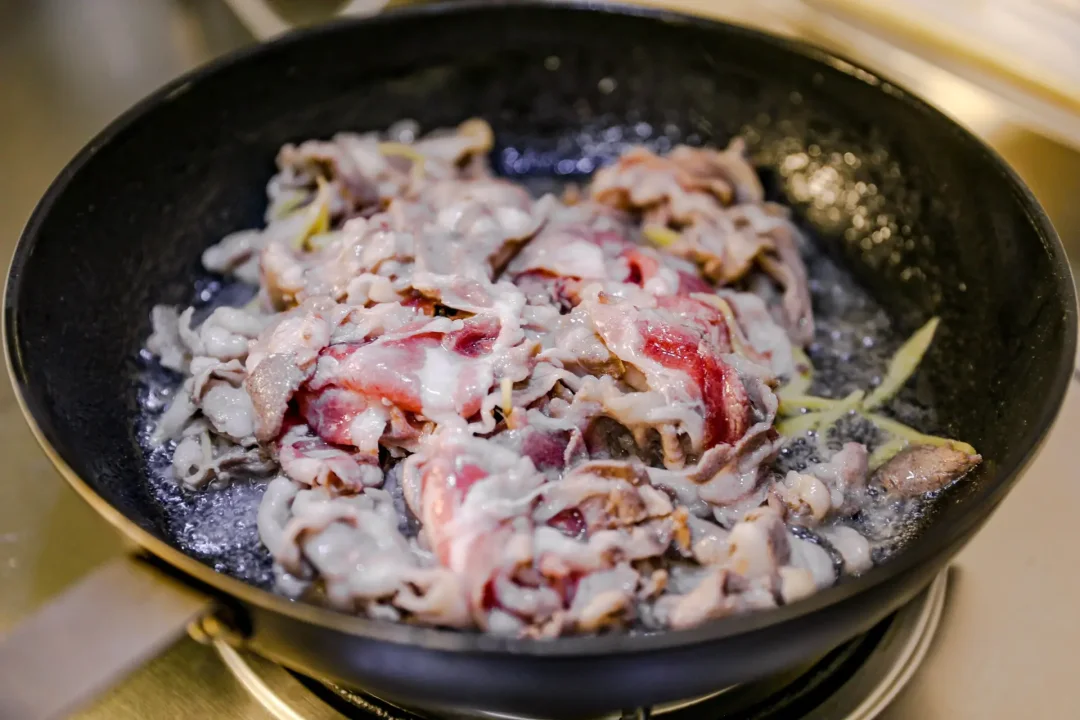 1,锅中加食用油,烧热一些,加入羊肉卷,放入姜丝煸炒羊肉,放入黄酒,一点醋去腥,加入酱油,稍微可以多一些。