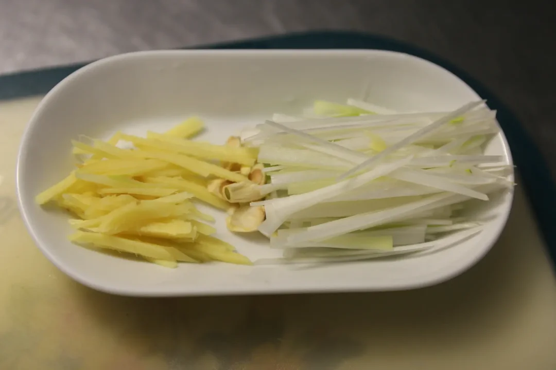 2.放入白开水,加入白胡椒粉,装盘,放入葱丝和蒜末,再放上一点点醋。