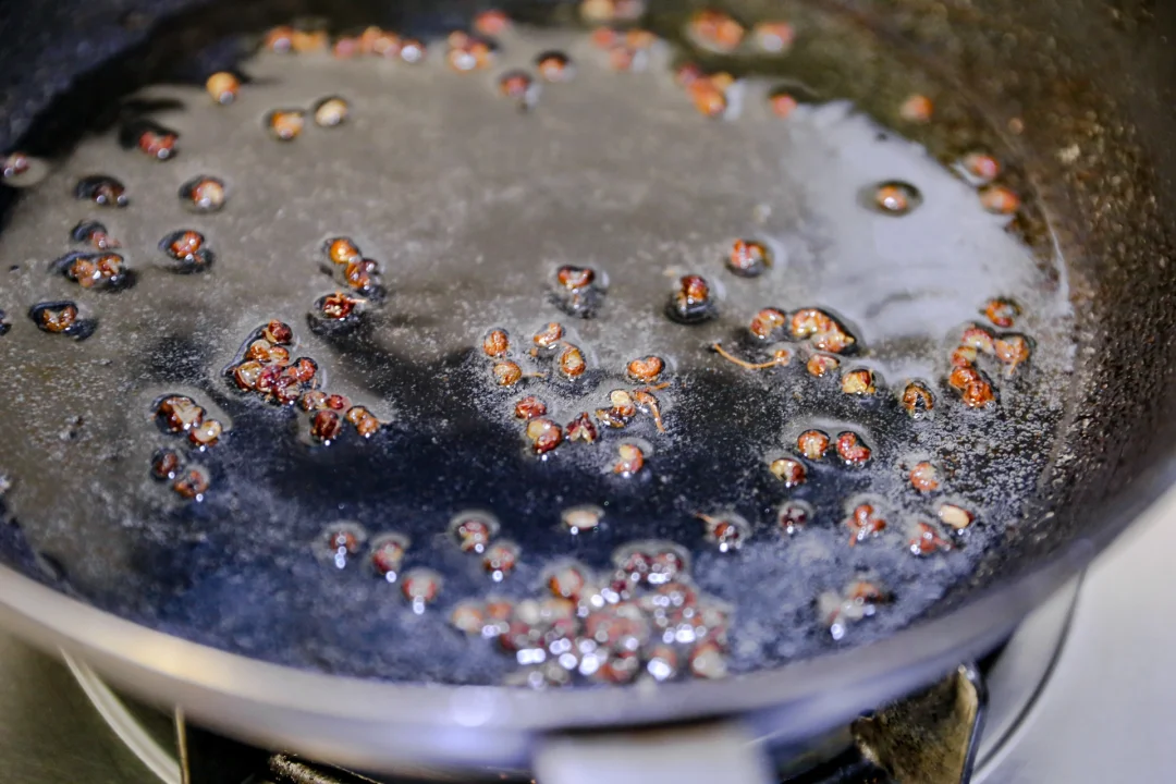 3.锅中加入食用油,放入花椒,炸黑之后捞出来,姜入姜和葱炸出香味之后,泼在做好的羊肉汆上。