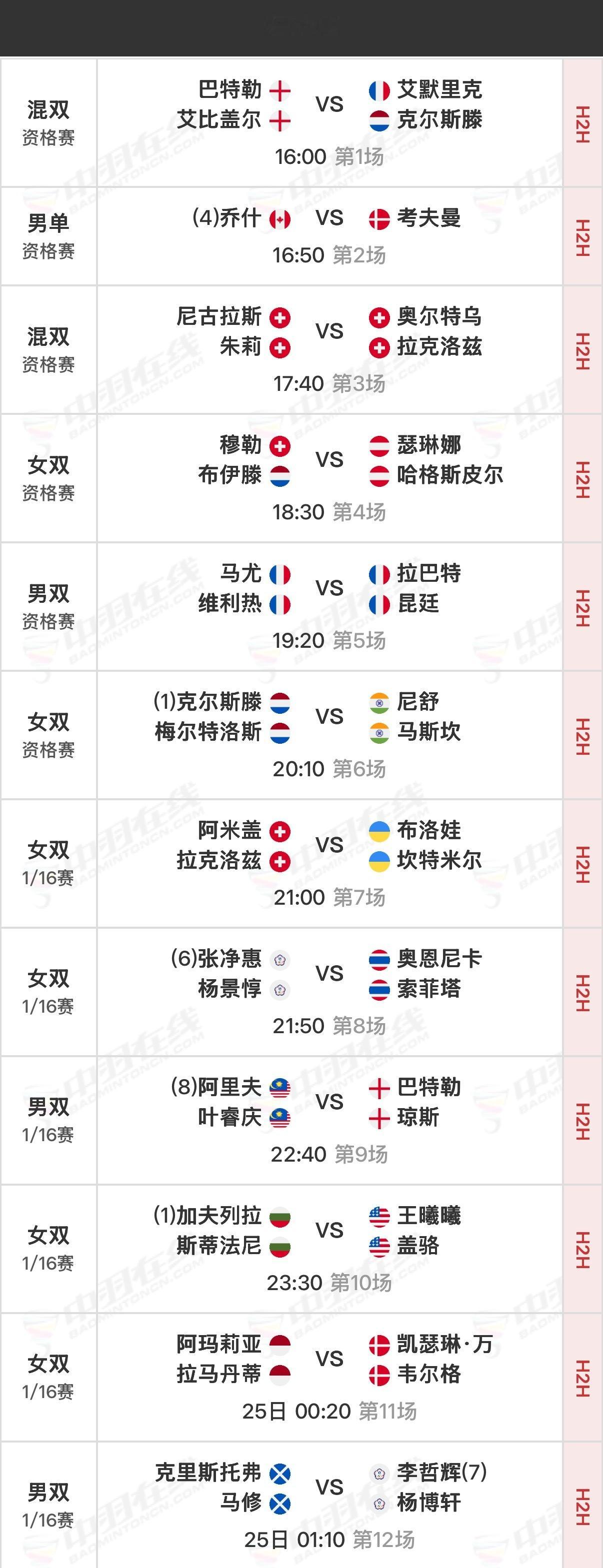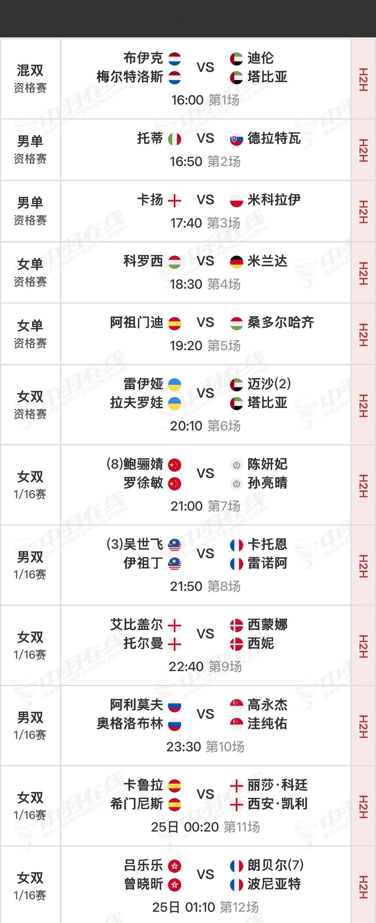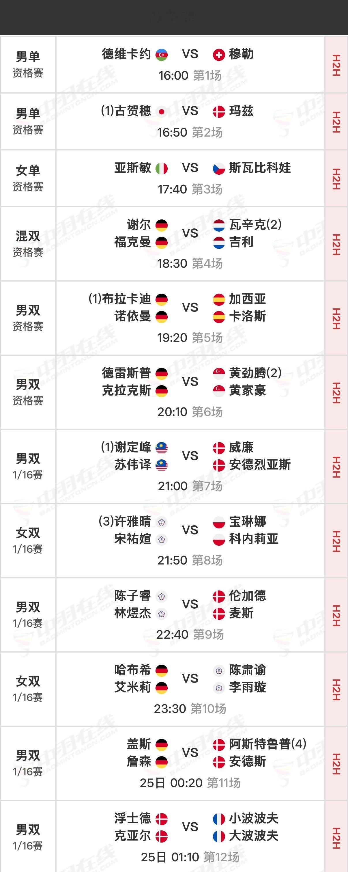 2026年德国羽毛球公开赛 首日赛程资格赛16:00开始,正赛21:00开始,可在羽协公众号/视频号、优酷观赛实时比分:网页链接官方赛程:网页链接