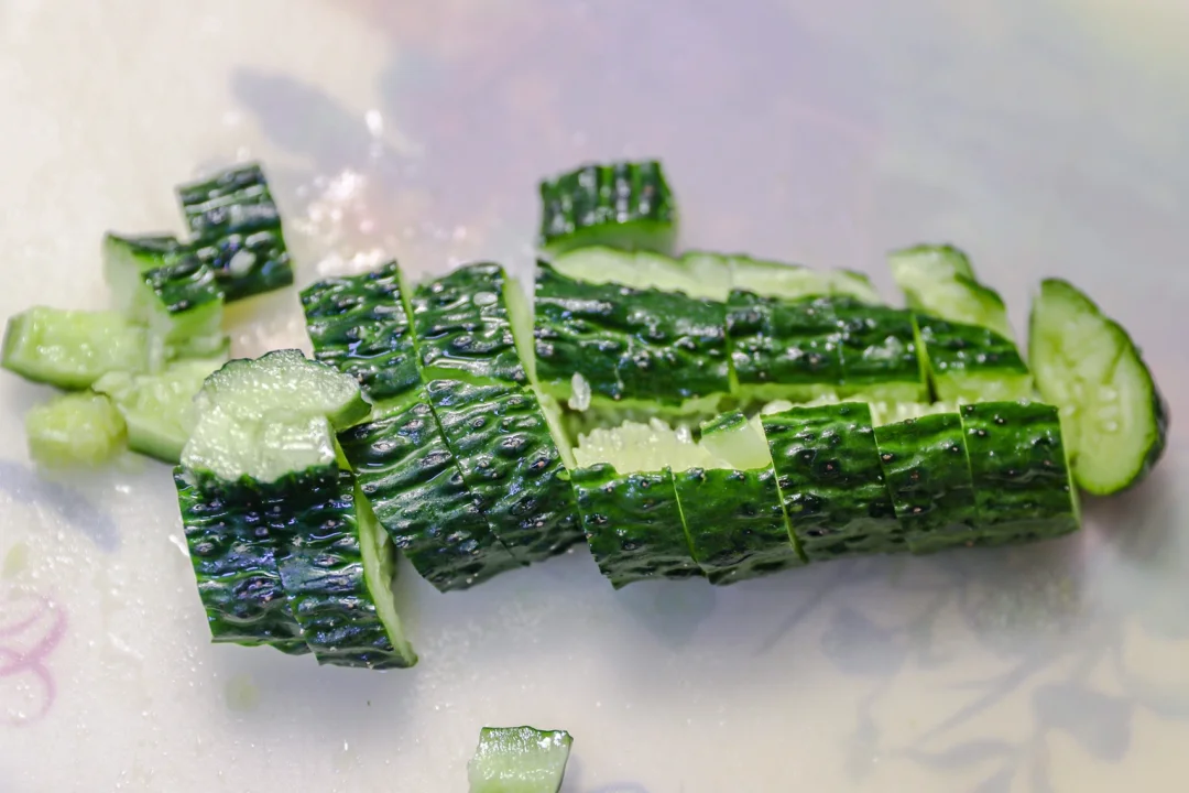1.黄瓜洗净,拍松拍散,斜切成块。