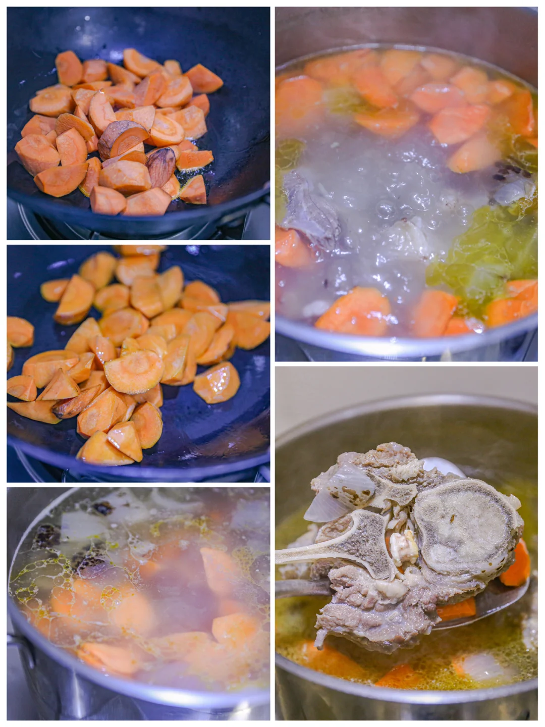 3.胡萝卜切成滚刀块,炒一下。炒一下可以让胡萝卜素充分发挥出来,让丰富的油脂包裹住蔬菜,放入炖好的牛尾汤中,继续炖30分钟。