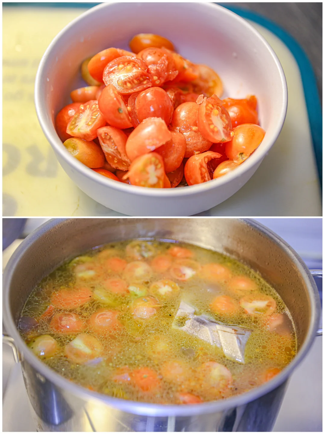 4.西红柿切成大块,放入汤中,炖10分钟,最后加入芹菜颗粒。放入盐和白胡椒调味,即可出锅。
