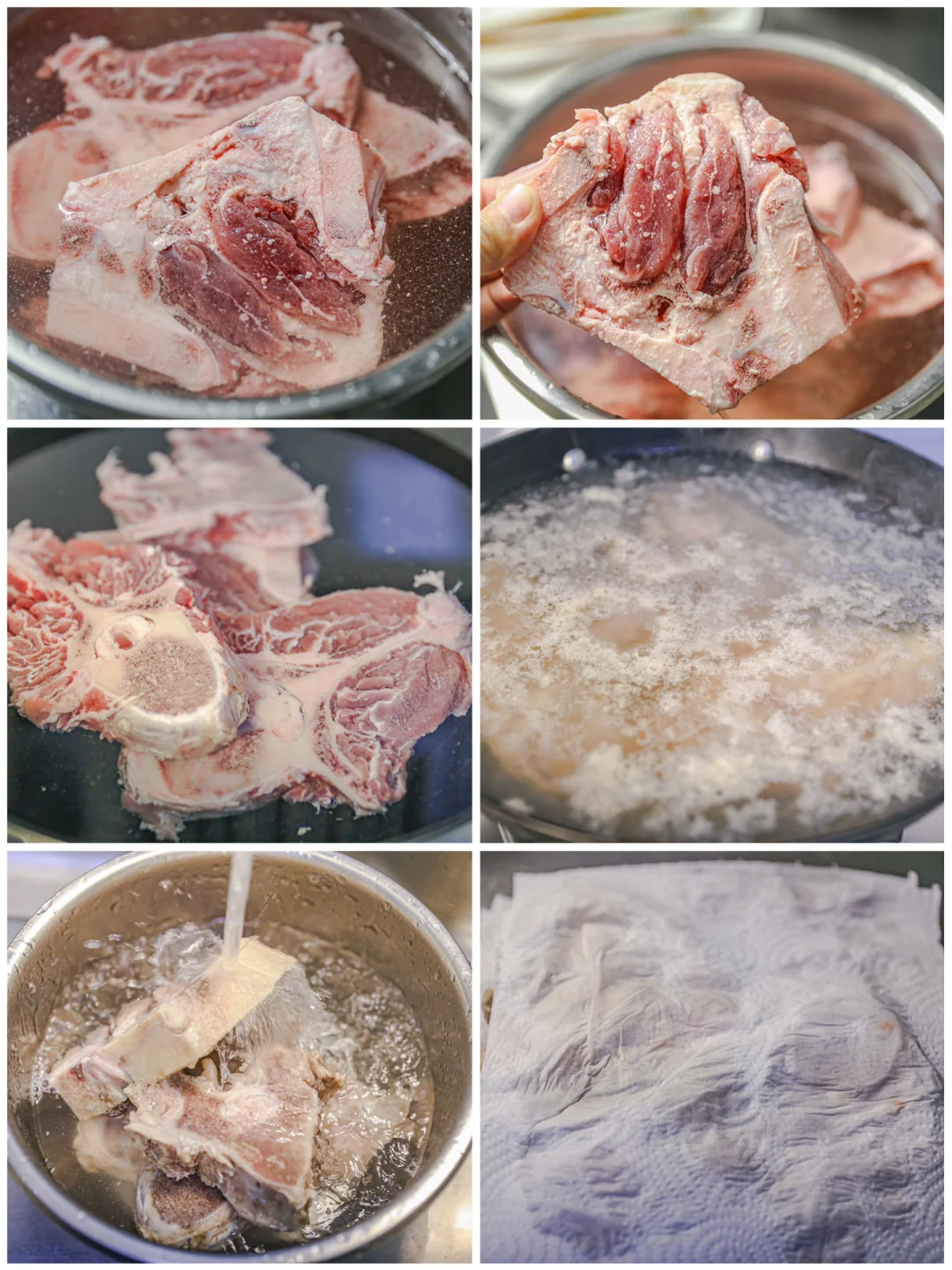 1.牛尾提前用冷水浸泡2-3个小时,去除多余的血水。冷水下锅,即将沸腾但没有沸腾的时候,血沫出来的时候,关火,然后用热水冲洗干净,用厨房纸巾擦干牛尾表面的水分。、