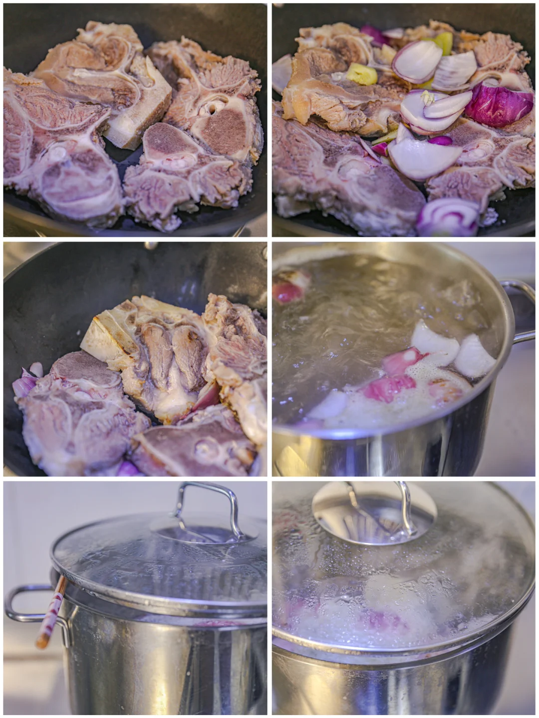 2.取平底锅,不用放油,将牛尾煎到两面金黄,将入姜片和洋葱片,同样也煎到金黄色,加入开水。(500克牛尾1000毫升热水),大火烧开,中小火炖90分钟。