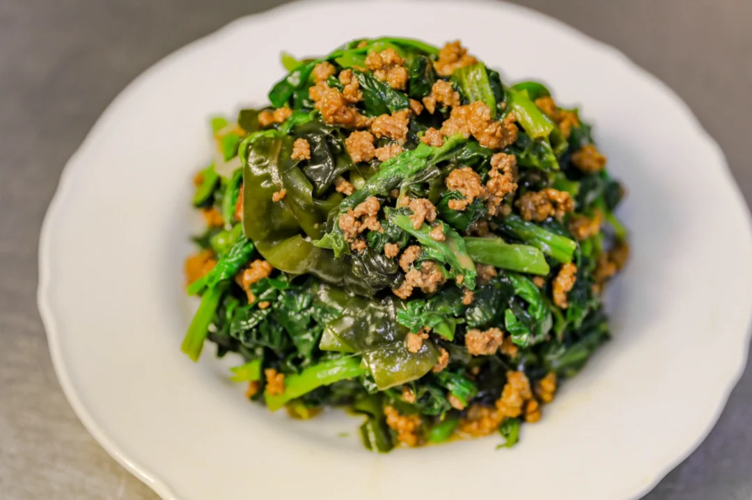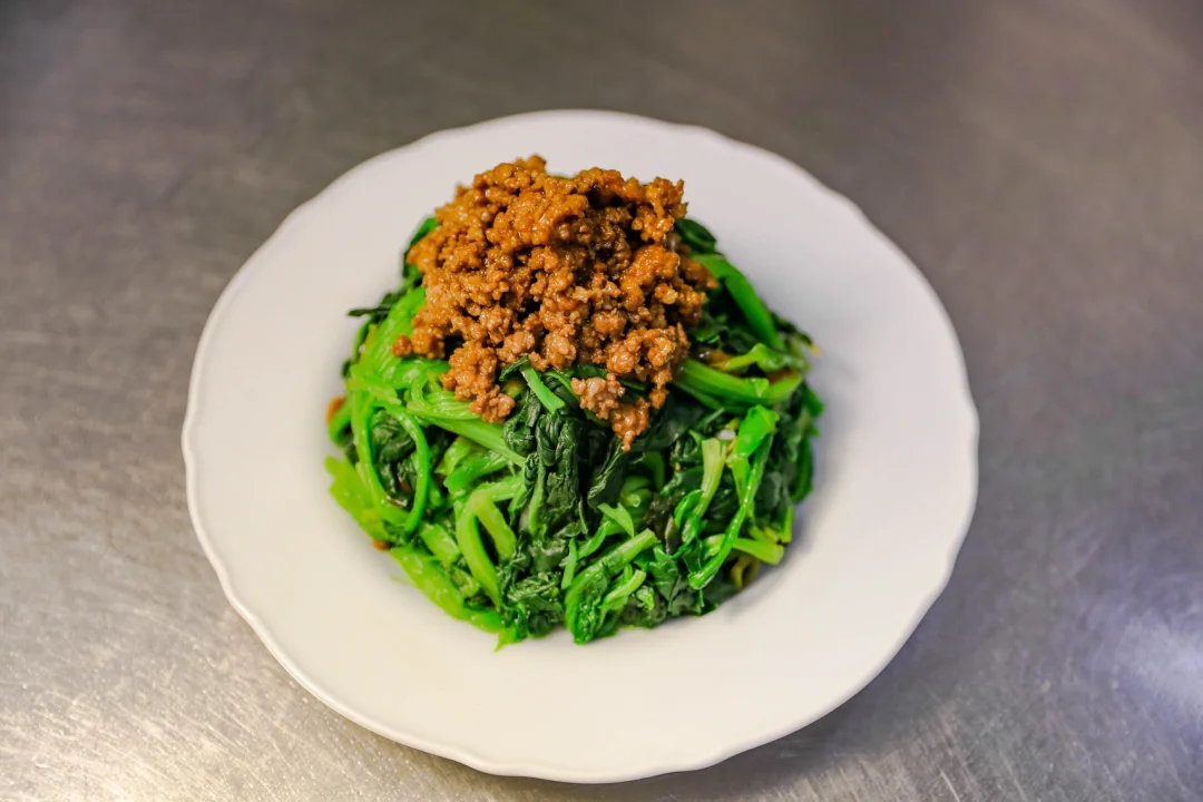 ✨4.将菠菜整齐放入盘中,淋上肉酱即可。