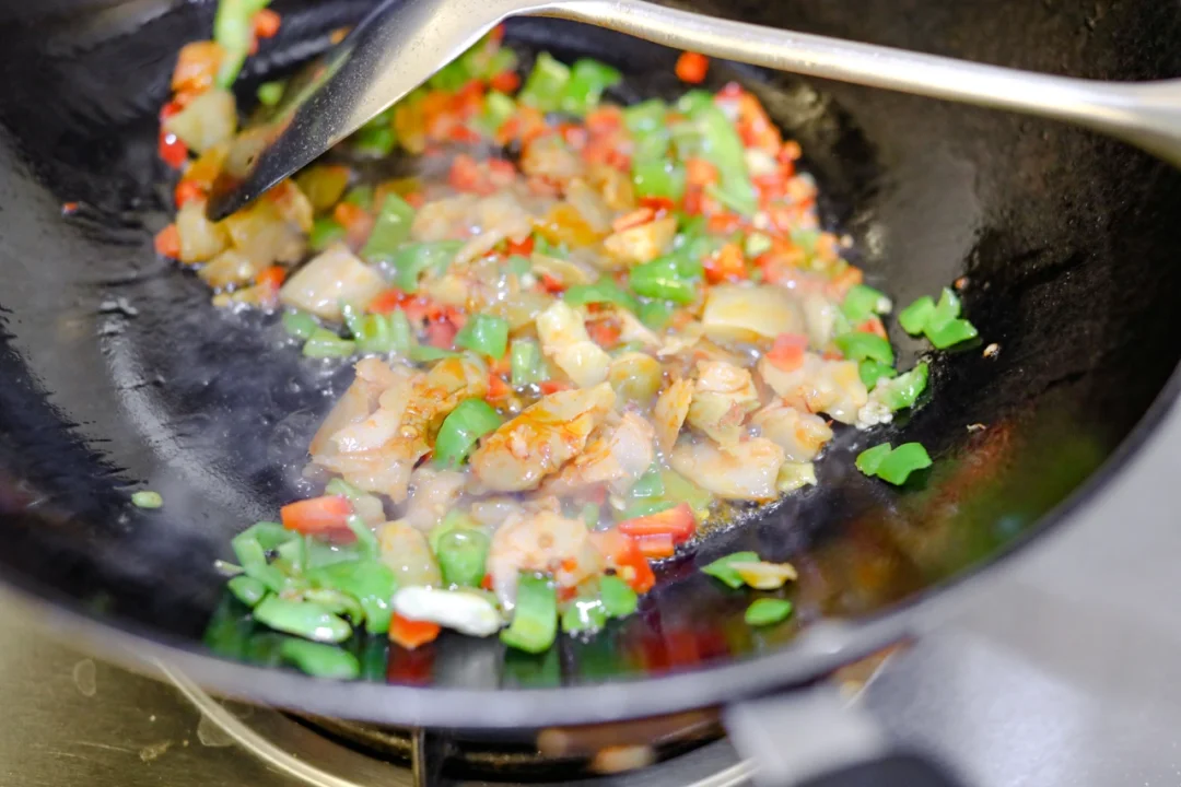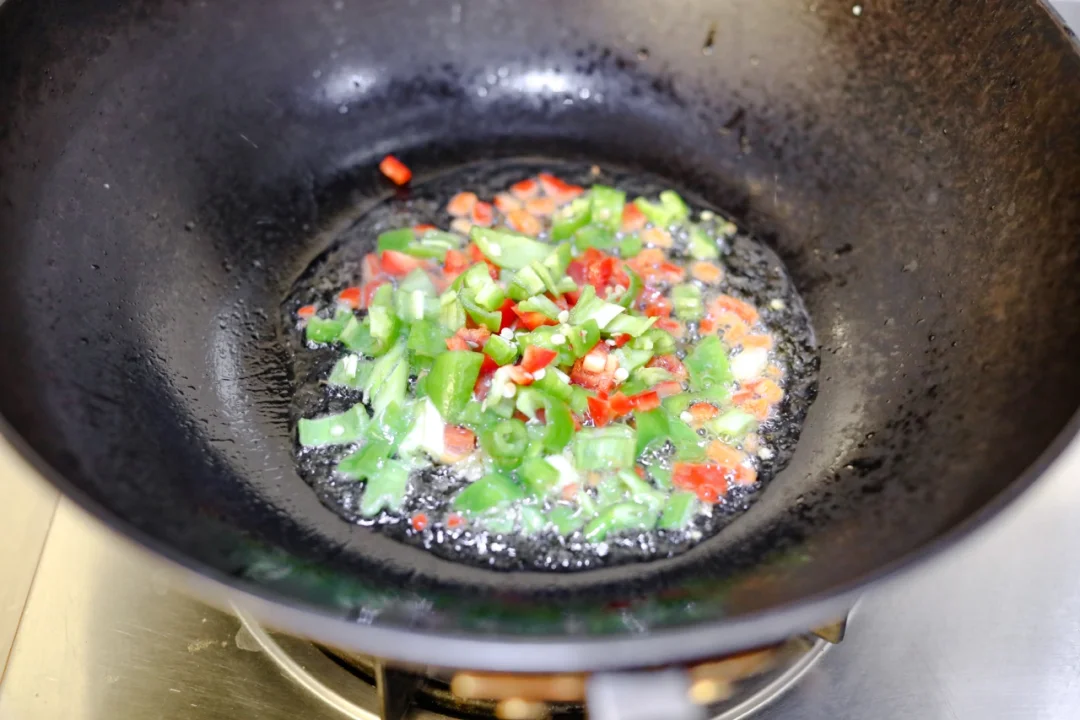 1.青红辣椒切成小丁儿,锅烧热放油,把青红辣椒放进去炒一下,加入榨菜,加入前几天做杂酱面剩下的炸酱适量,无需添加任何调味料,搅拌均匀,让味道充分融合就好了。