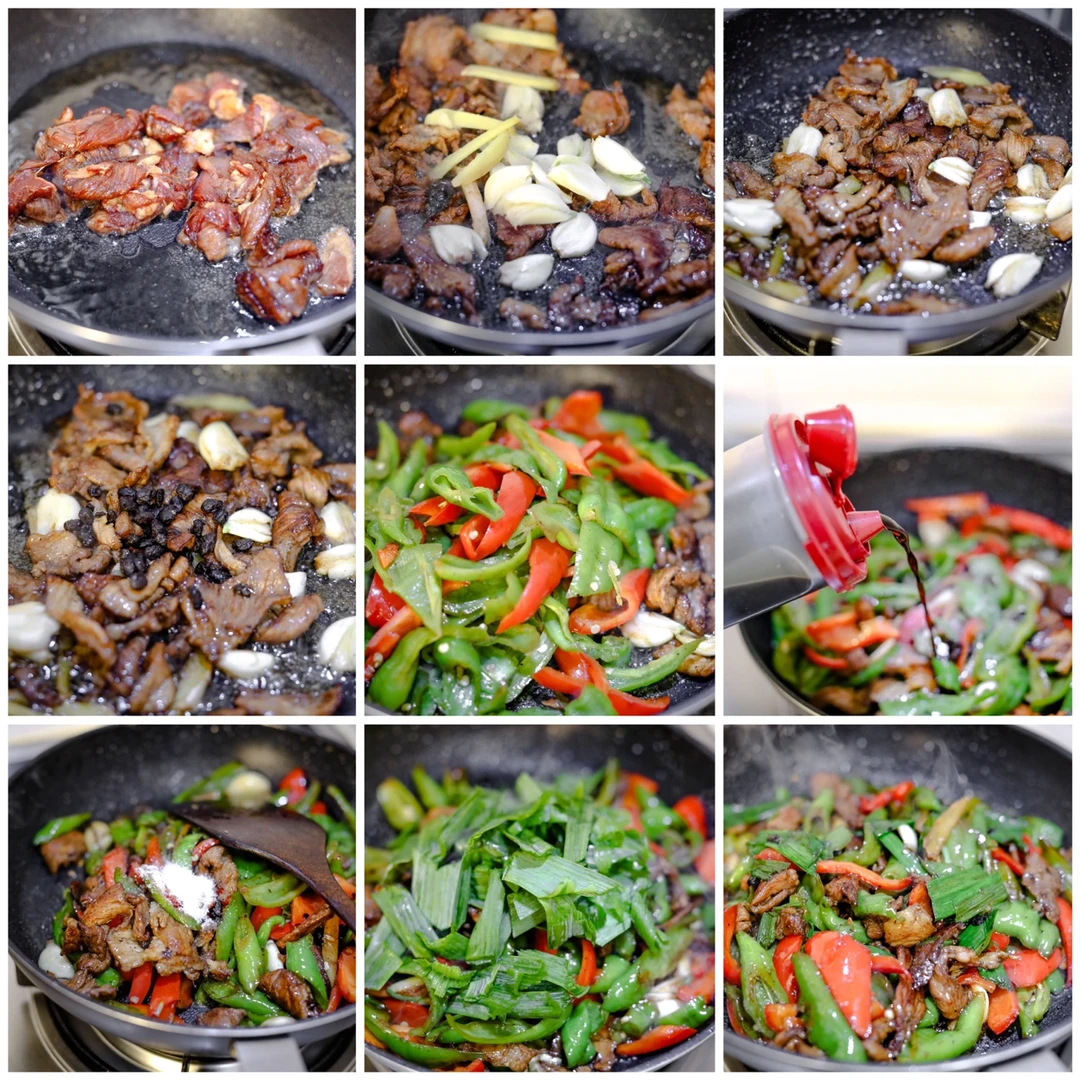 4.锅中倒入食用油,如果有肥肉片的话,可以先炒一下,油脂完全出来,变成金黄色,加入瘦肉片,翻炒,加入大蒜,姜片,一点豆豉,加入辣椒翻炒均匀,加入食盐,生抽,老抽,白糖,最后加入青蒜,起锅之前,来一点锅煸醋。