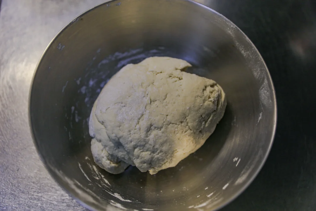 把所有食材放入面盆里,揉成粗糙的面团,醒10分钟。继续揉一会儿,再醒10分钟,再揉一会,再醒40分钟。