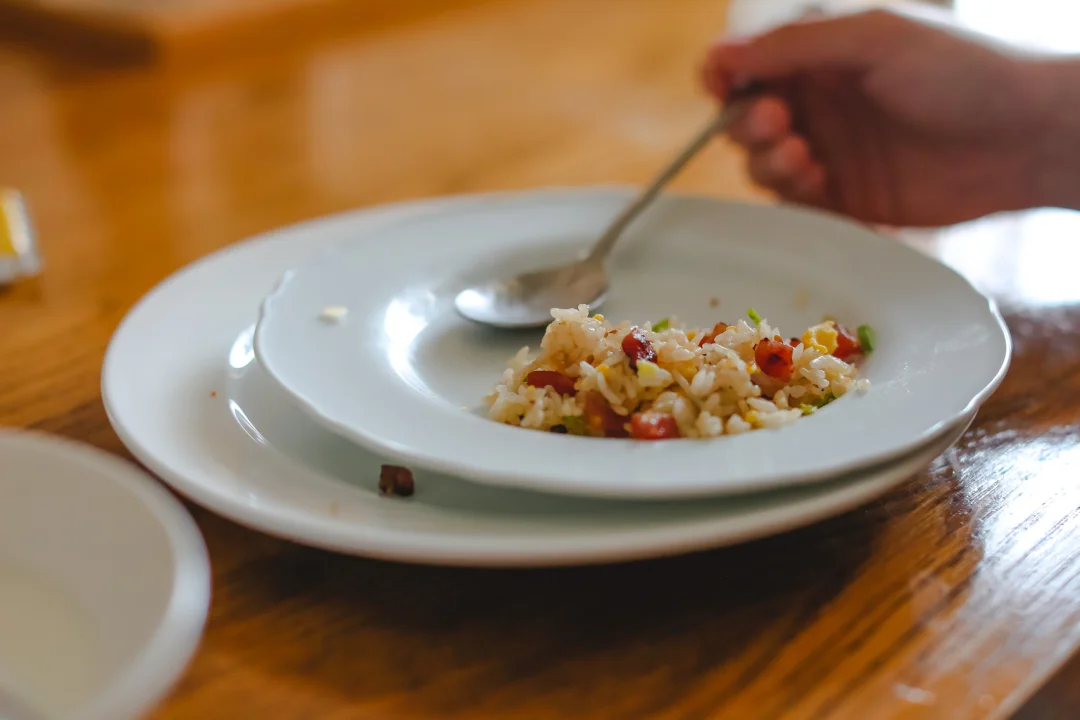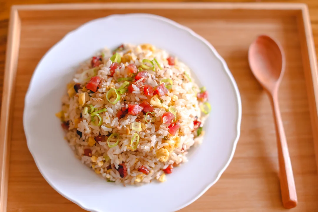 6.加入白米饭拌一拌,把所有的食材都混合均匀。