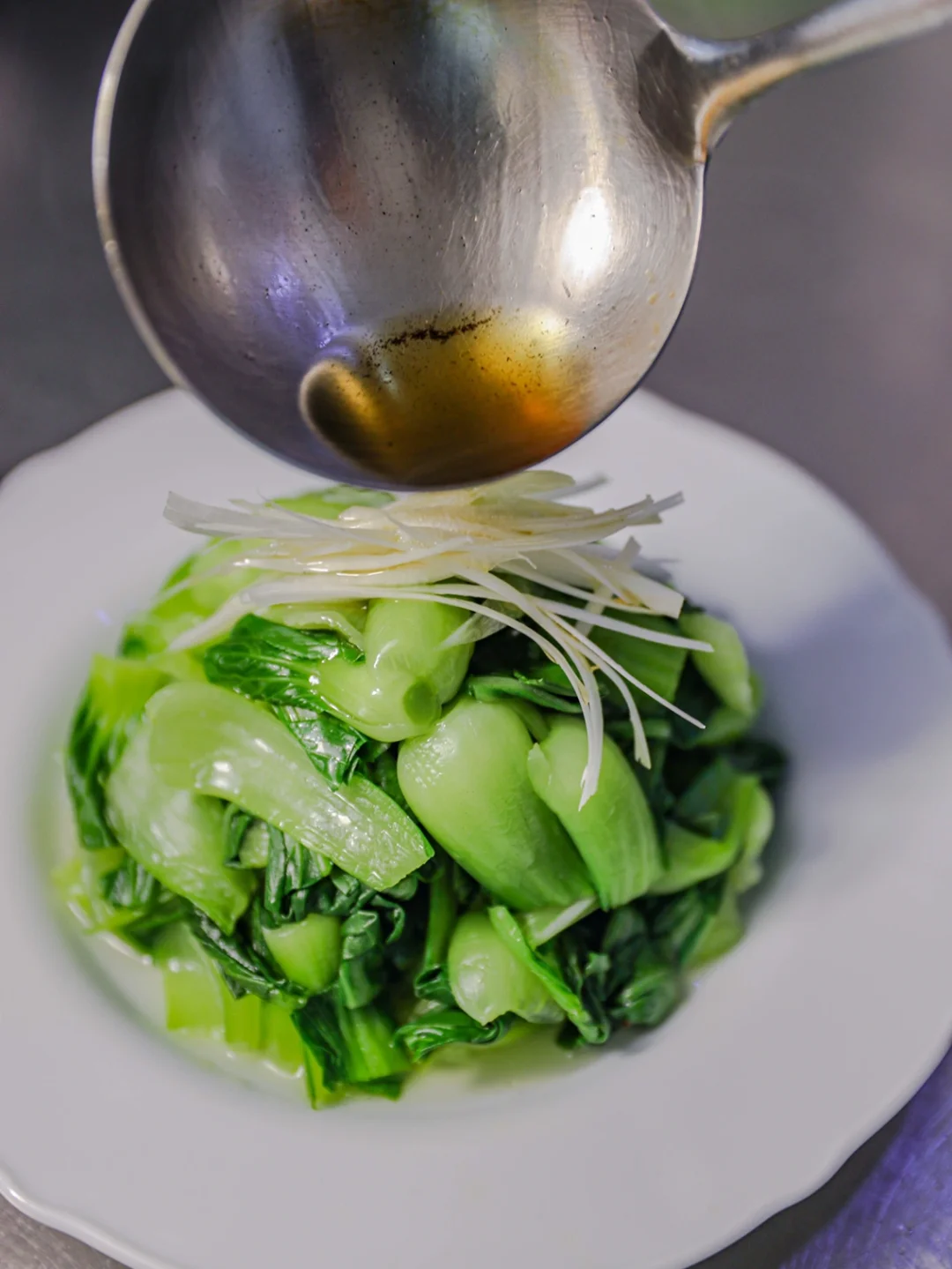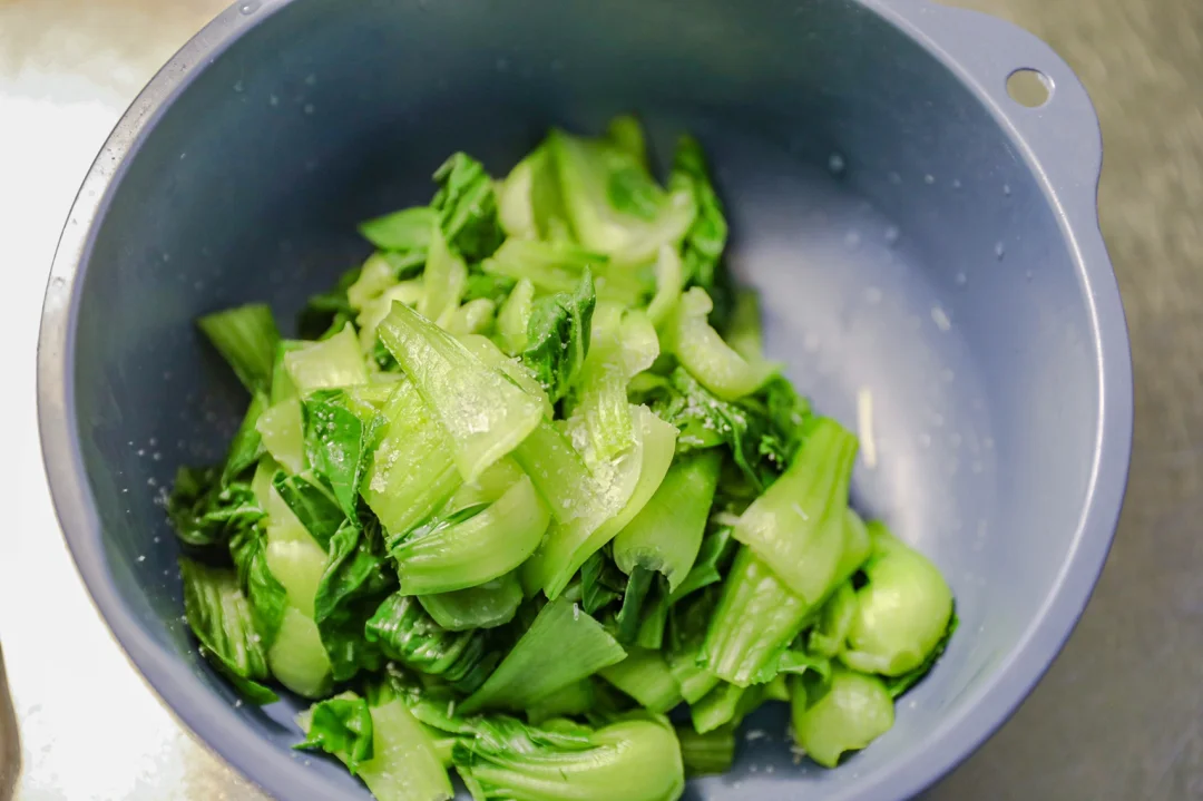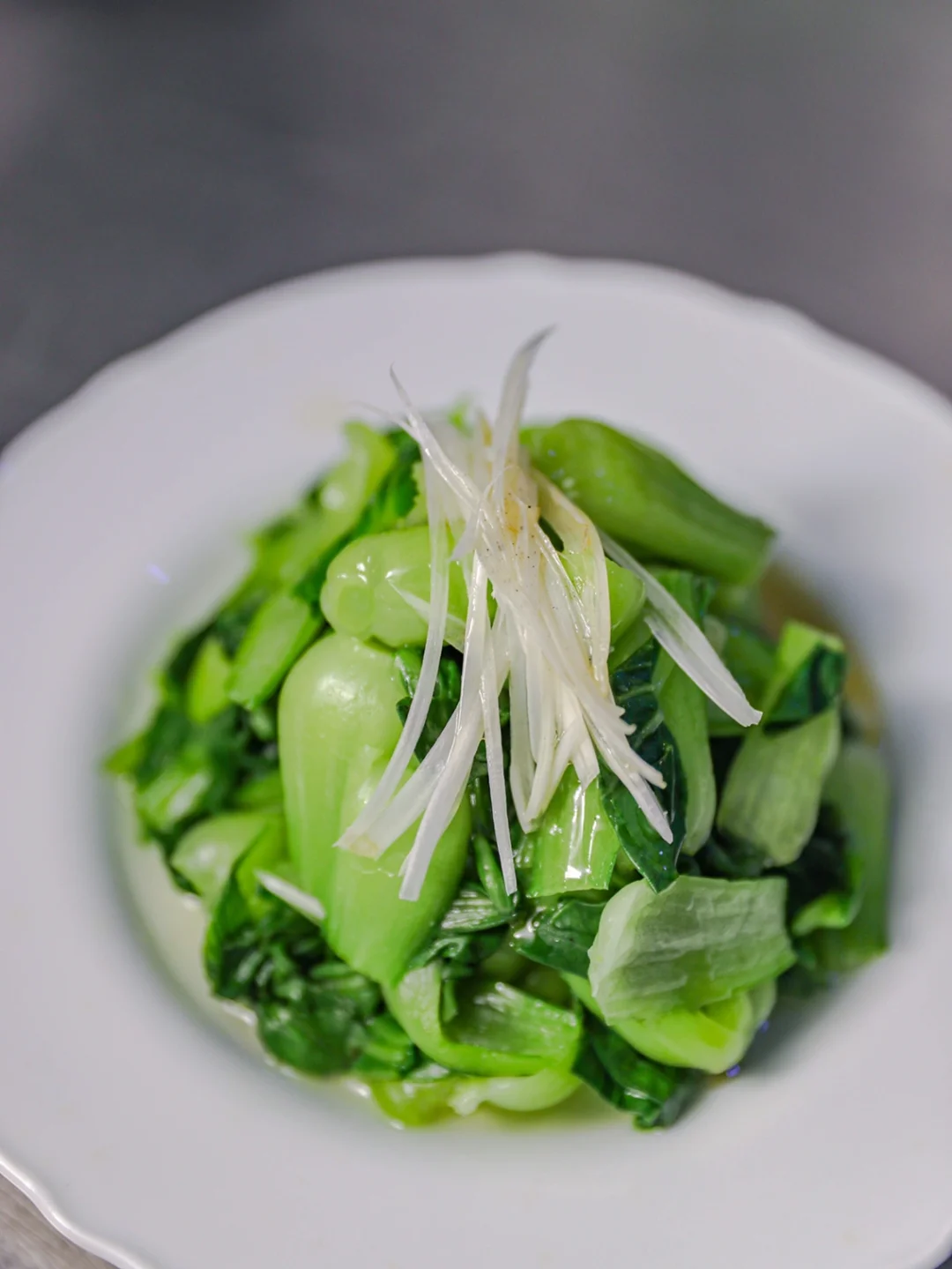 🌈小油菜清洗干净,切成均匀小段。用热水汆烫一下,捞出来沥干水分。油菜心中放入碗中,加入盐和味精,放上一点姜末和葱白丝。