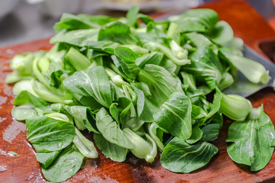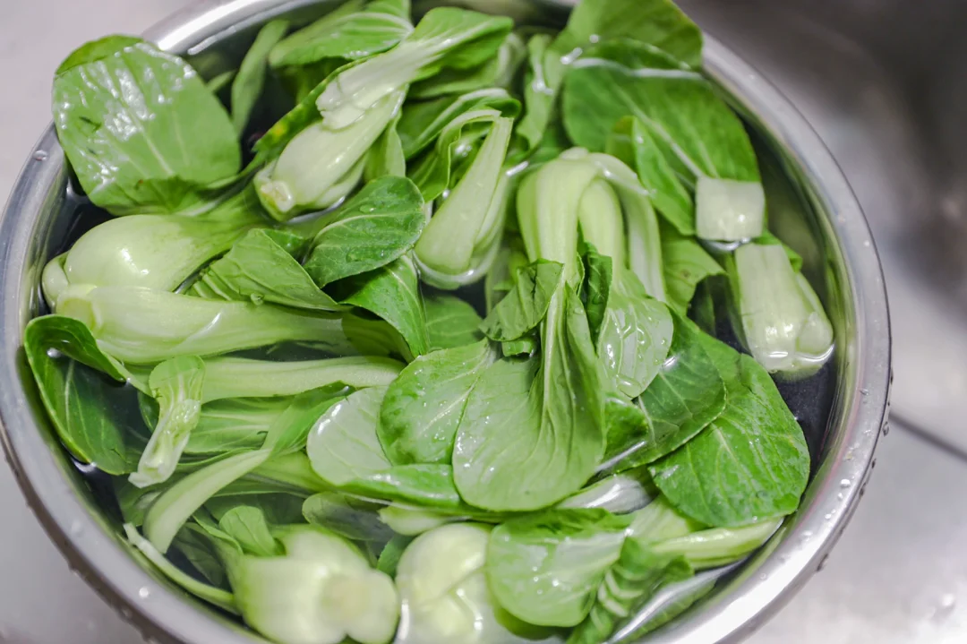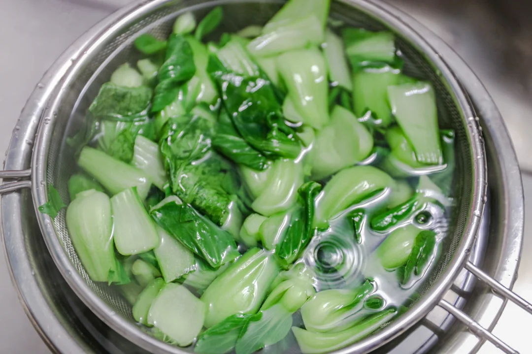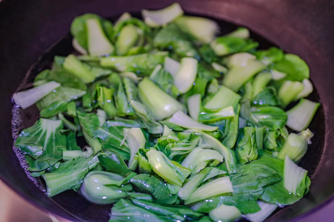 🌈小油菜清洗干净,切成均匀小段。用热水汆烫一下,捞出来沥干水分。油菜心中放入碗中,加入盐和味精,放上一点姜末和葱白丝。