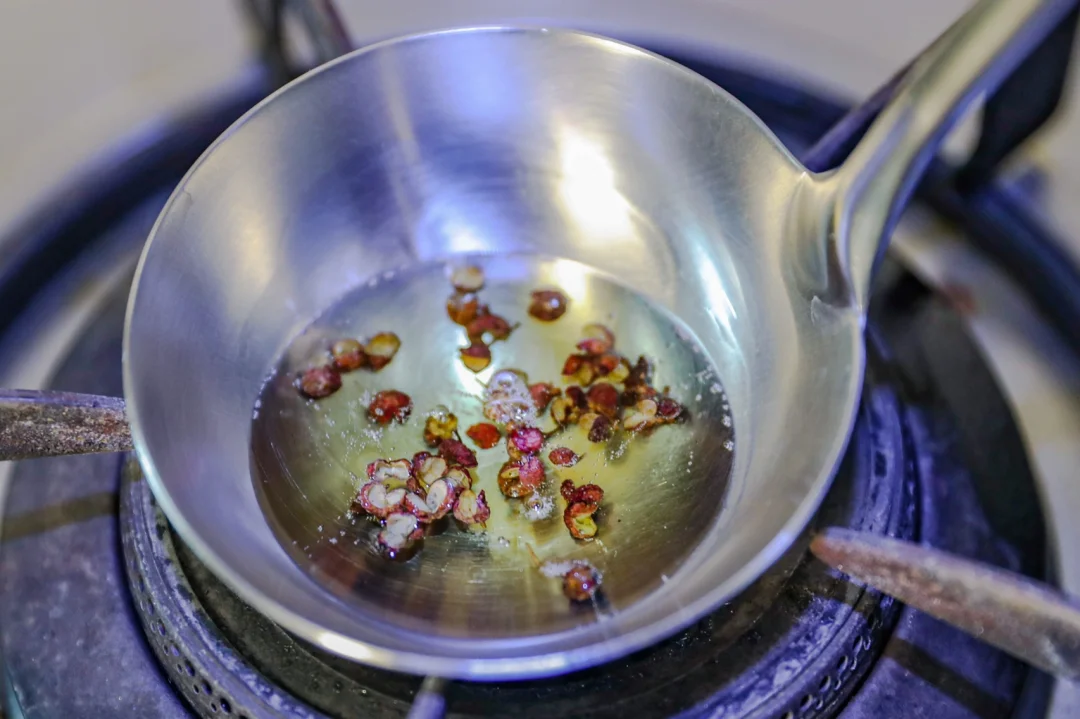 🌈用勺子或者小锅加入一点油,放上点花椒炸出香味,捞出花椒,留下花椒油。趁热将花椒油倒在菜心上,搅拌均匀即可。