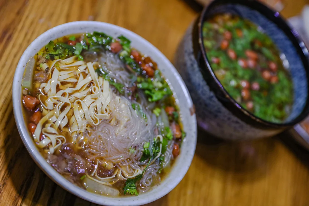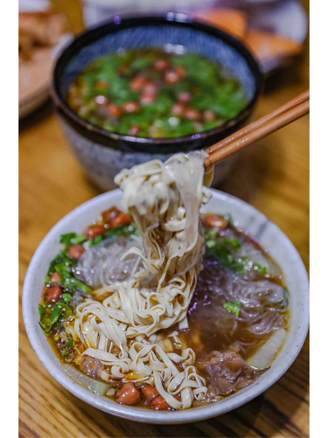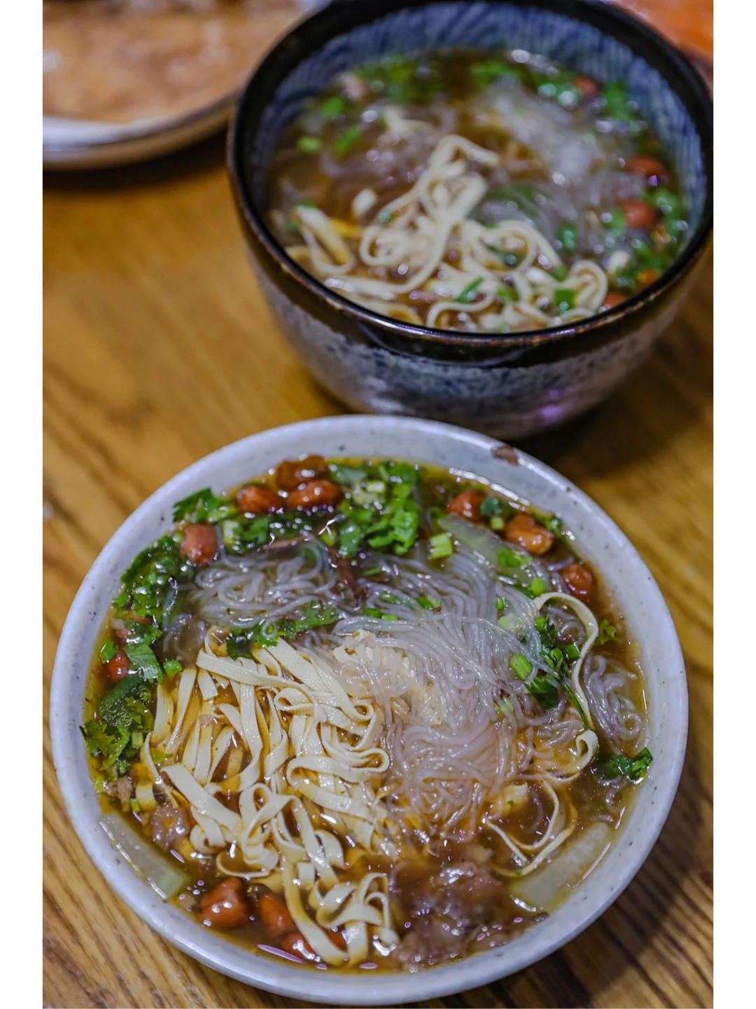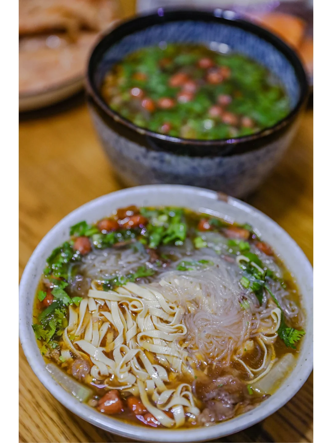 如果大家上次购买的牛肉高汤还没享用完,可以试着做一下。超薄豆腐皮切成细丝,粉丝凉水泡15分钟。准备一锅热水,把豆腐丝放进去汆烫1分钟,关火放入泡软的粉丝。捞起来放入碗中,加入牛肉面的高汤,撒上葱花香菜以及花生米即可。如果喜欢胡椒味道重一些的可以再单独加胡椒粉,喜欢吃辣可以再添加辣椒油~