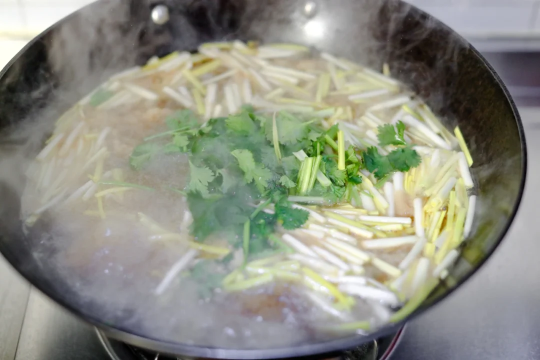 💕3.时间到了之后加入蒜黄段和香菜段,淋入芝麻油。