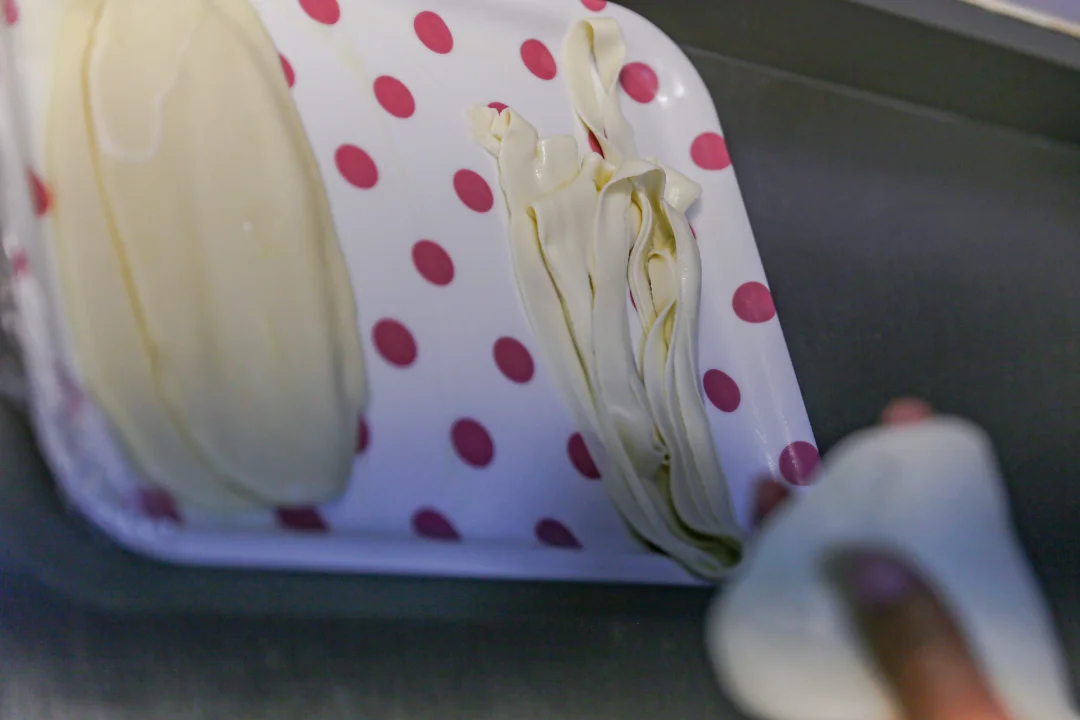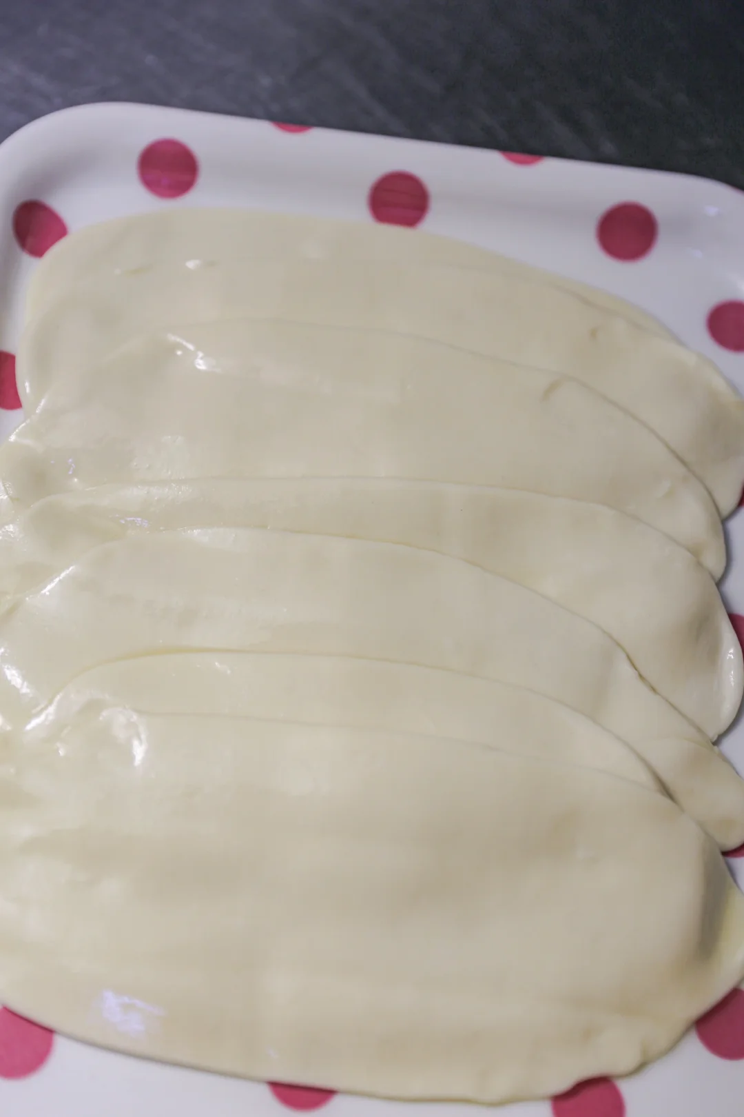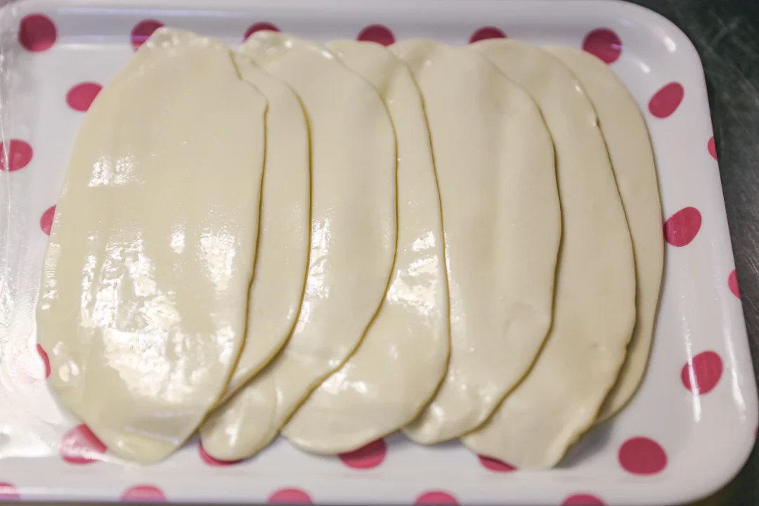 6.取出醒好的剂子压扁,用手均匀用力往两边拉,就可以成长条片装,从中间一撕为2,就是烩面了。