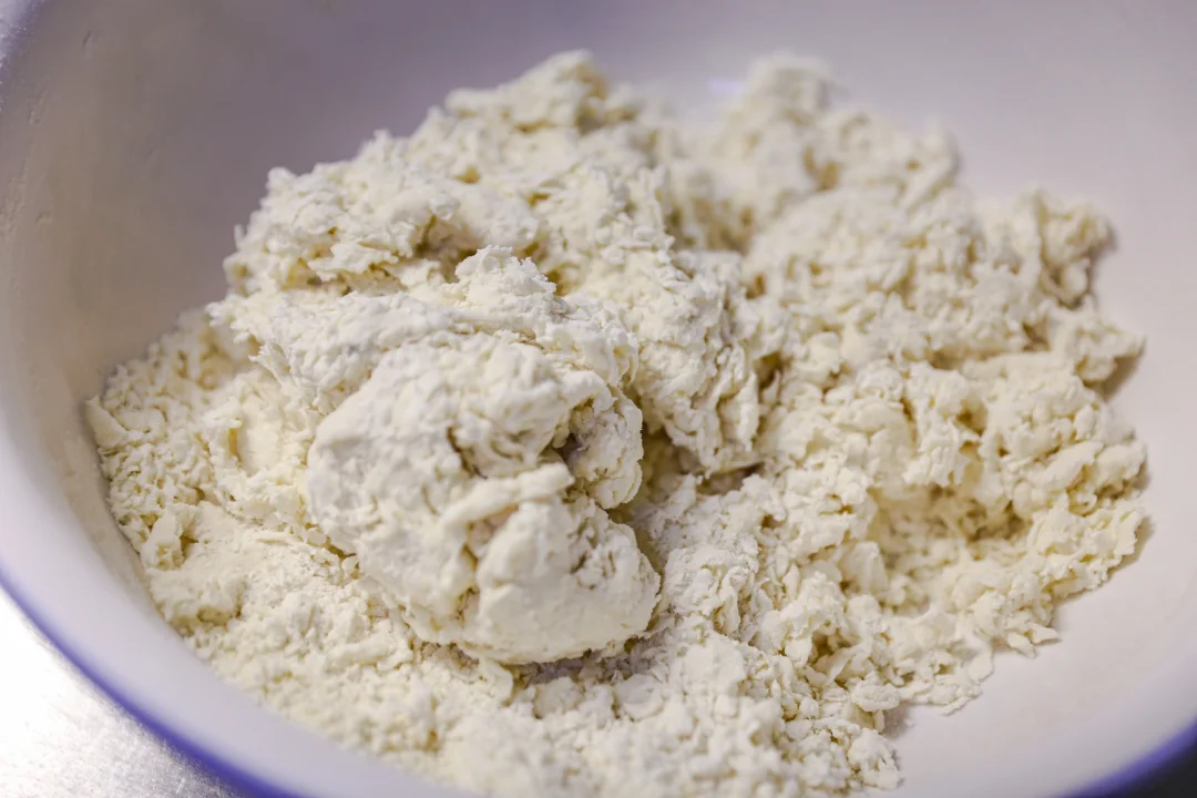 2.少量多次加入凉水,成絮状之后揉成团,醒20分钟。