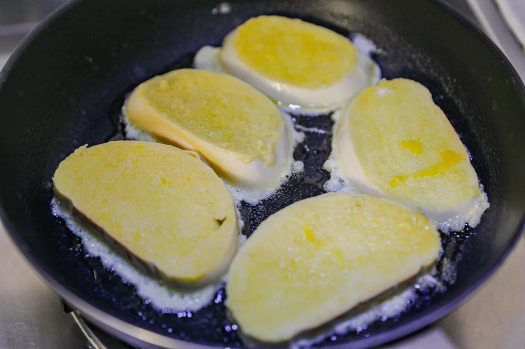 [草莓R]4.不粘锅抹上一层油,放入裹上蛋液的馒头片。