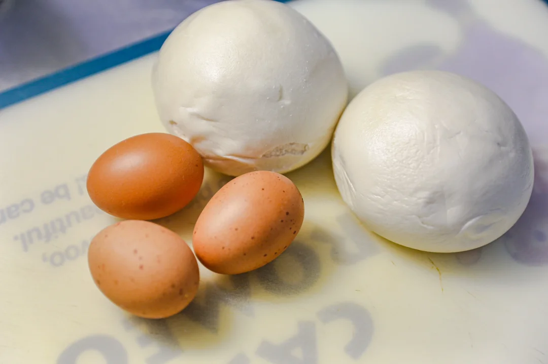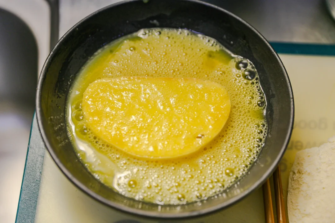[草莓R]3.馒头放入鸡蛋液中,浸泡10秒钟。