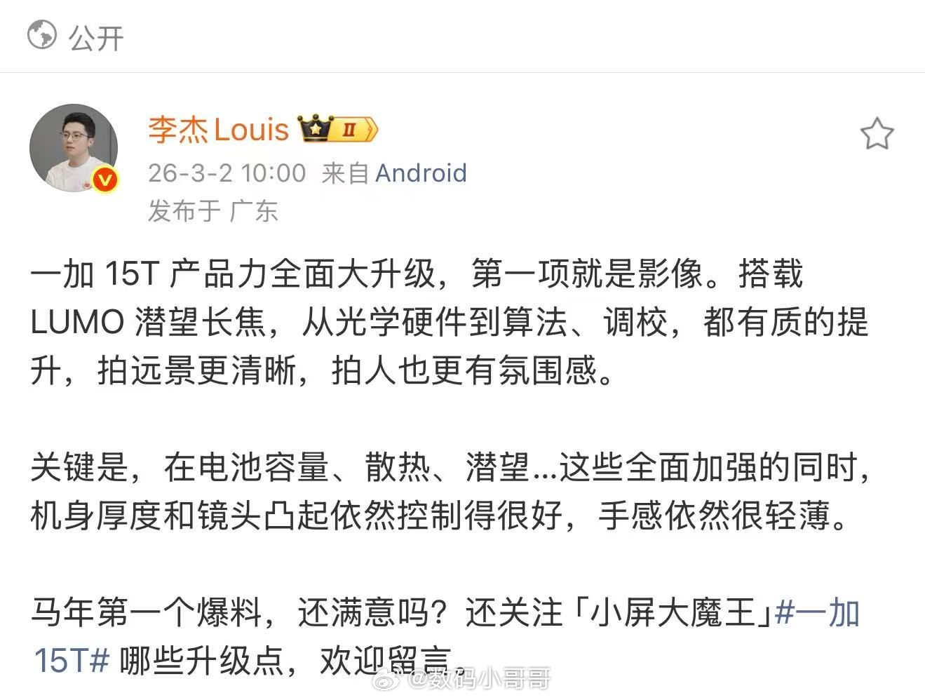 李杰今天这条爆料信息量真不小,直接拉满了我对 一加15T影像的期待值。