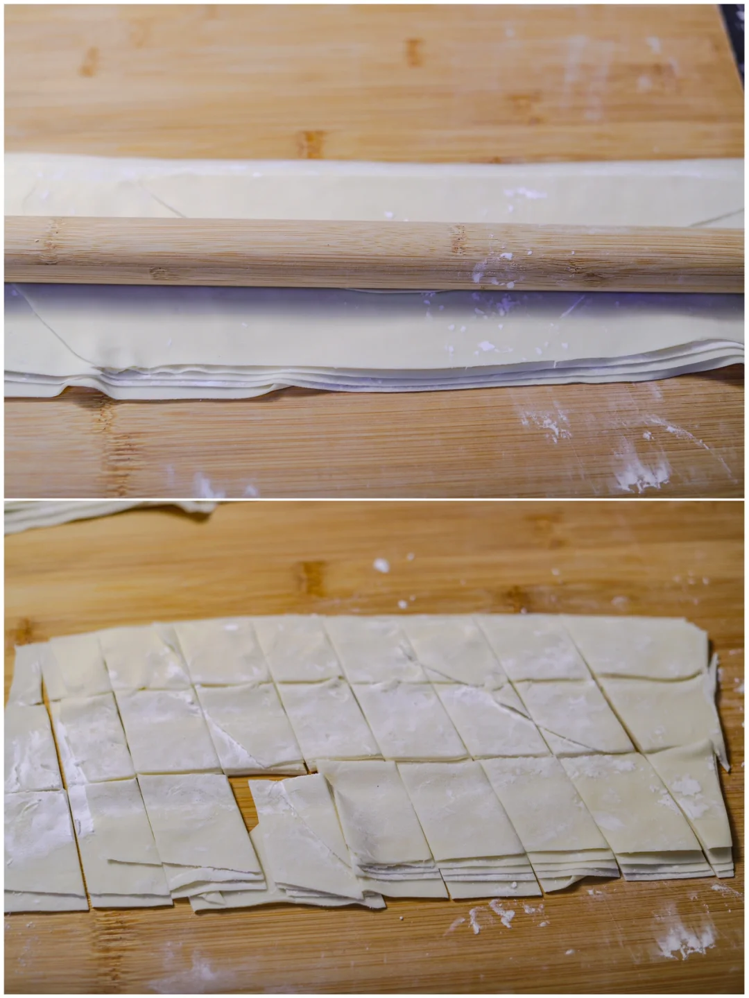 🌸最后用刀将缠在擀面仗的面片切开,切成菱形片即可。