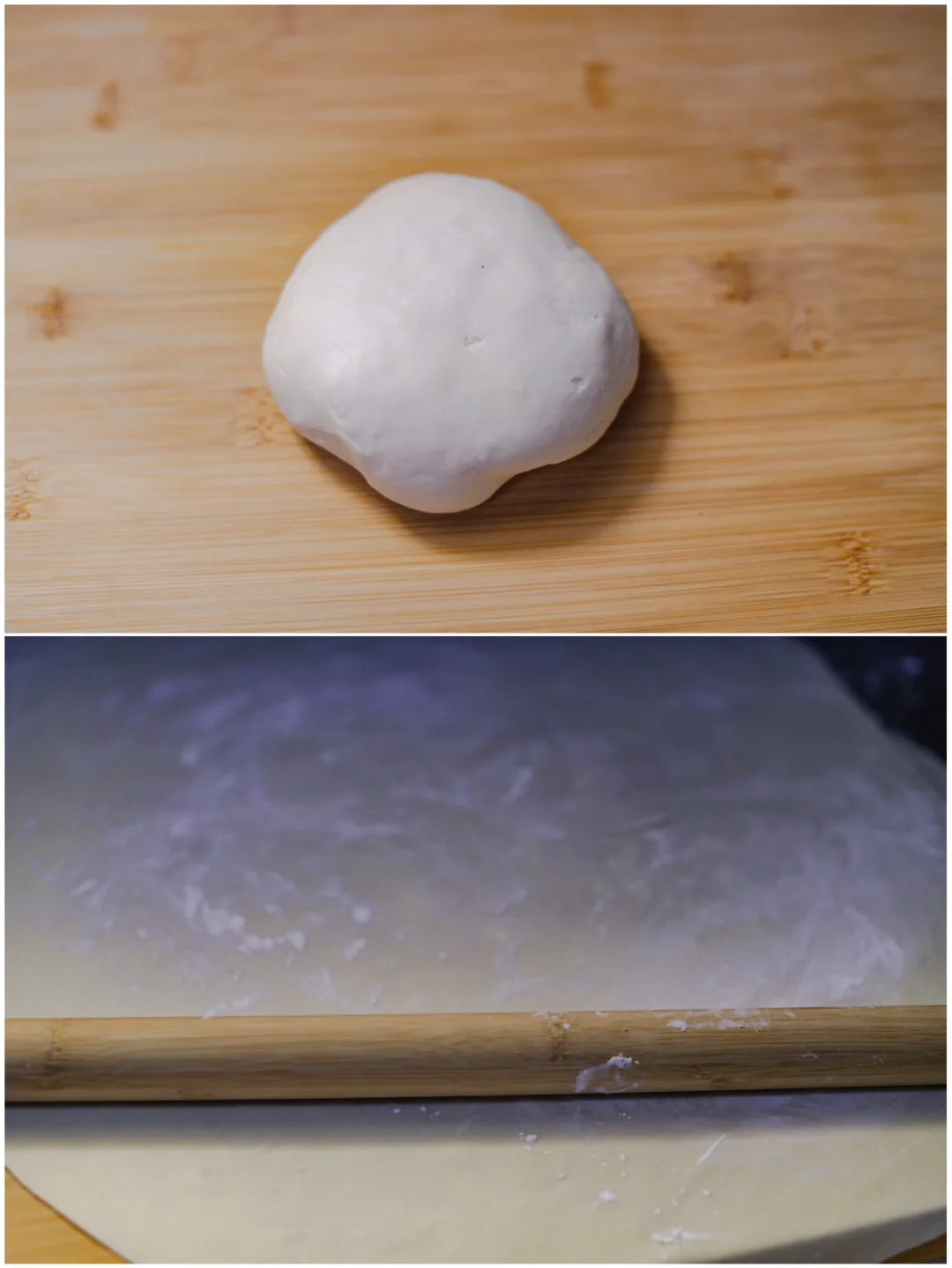 🌸然后擀面杖由中心向外压成中间厚四边薄的稍微厚一点的圆片。将面片缠在擀面杖上慢慢擀,手压着面片从里到两边散发力量,边擀边推,直至擀成薄片。