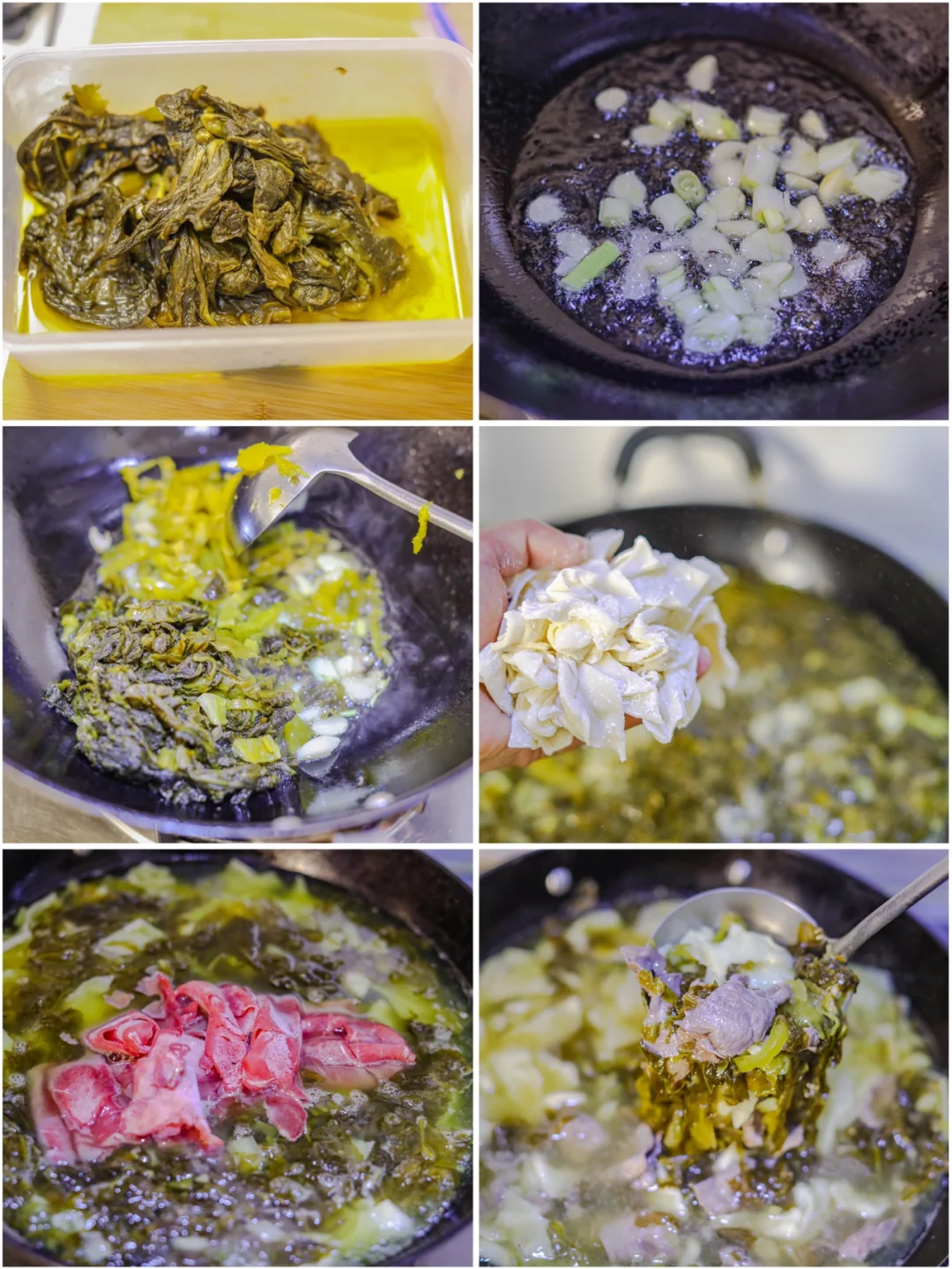 [种草R]锅烧热加入底油,放入葱和蒜爆香,加入酸菜丝,翻炒出香味加入开水。放入食盐和鸡精调味。