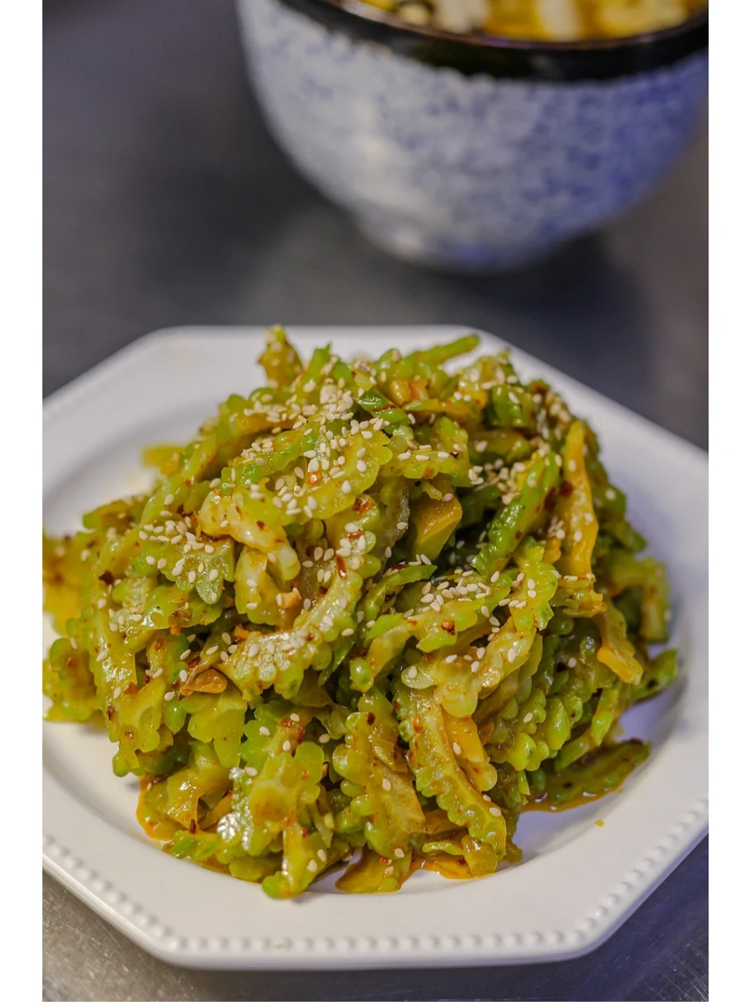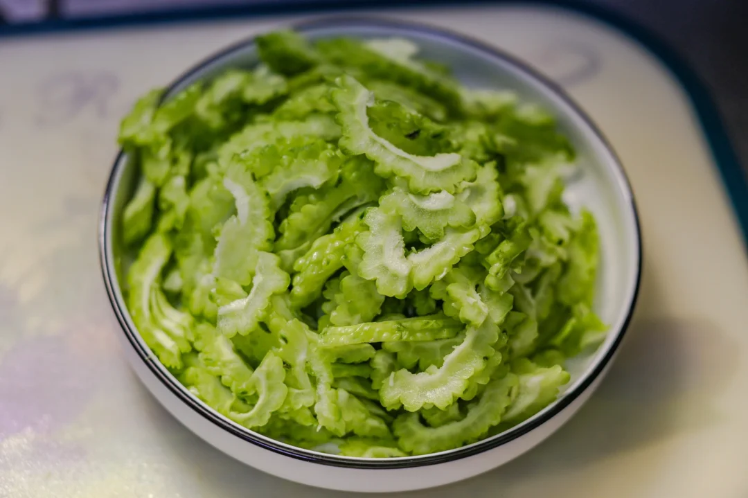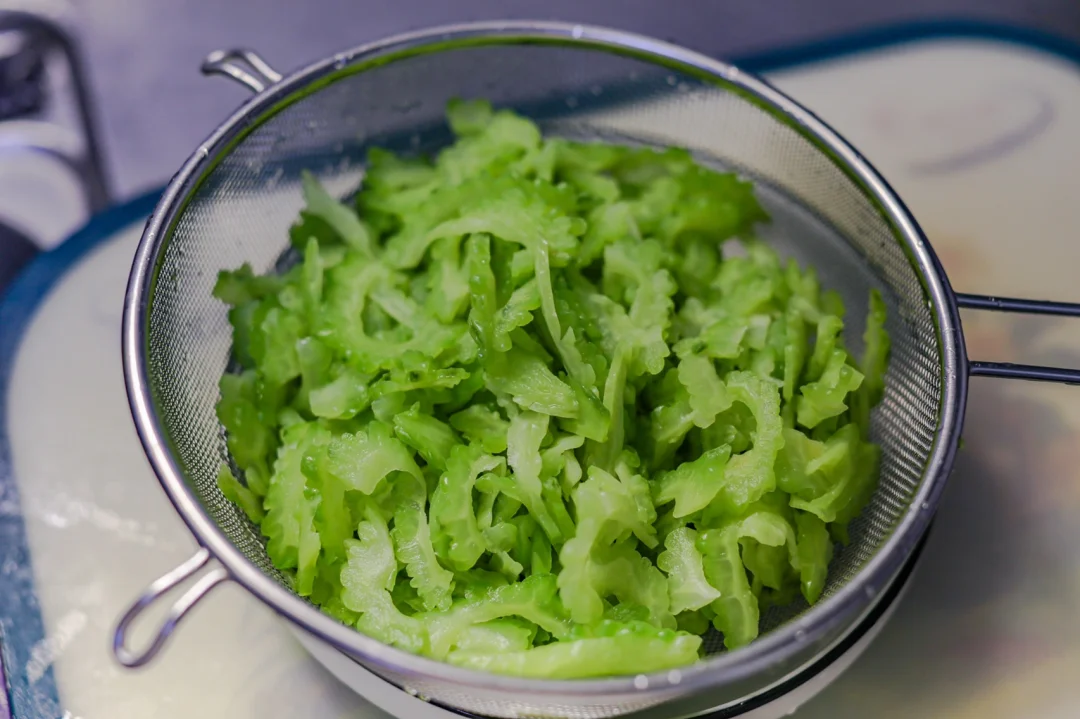 🌟3.将苦瓜放入沸水中焯至断生,放入冷水中过凉,沥干水分。