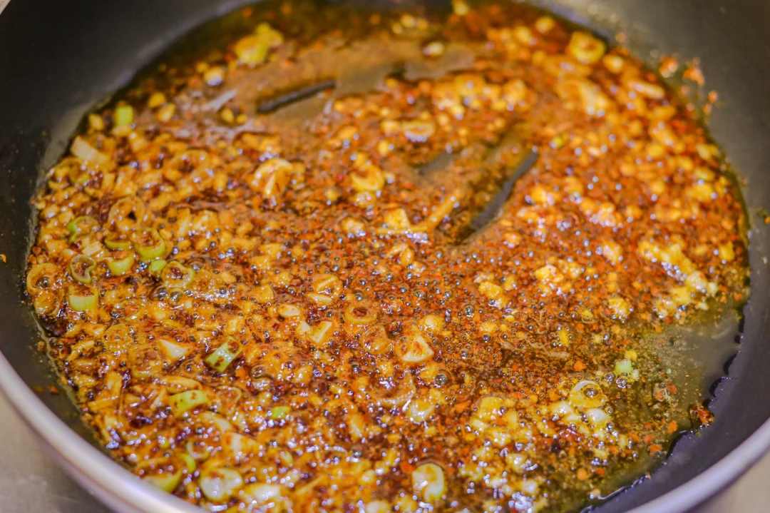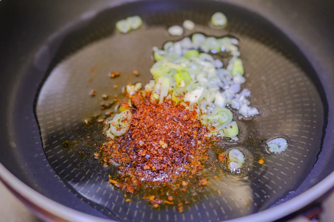 🌟5.锅中加入适量食用油,加入姜葱蒜末,加入辣椒粉末炒香。