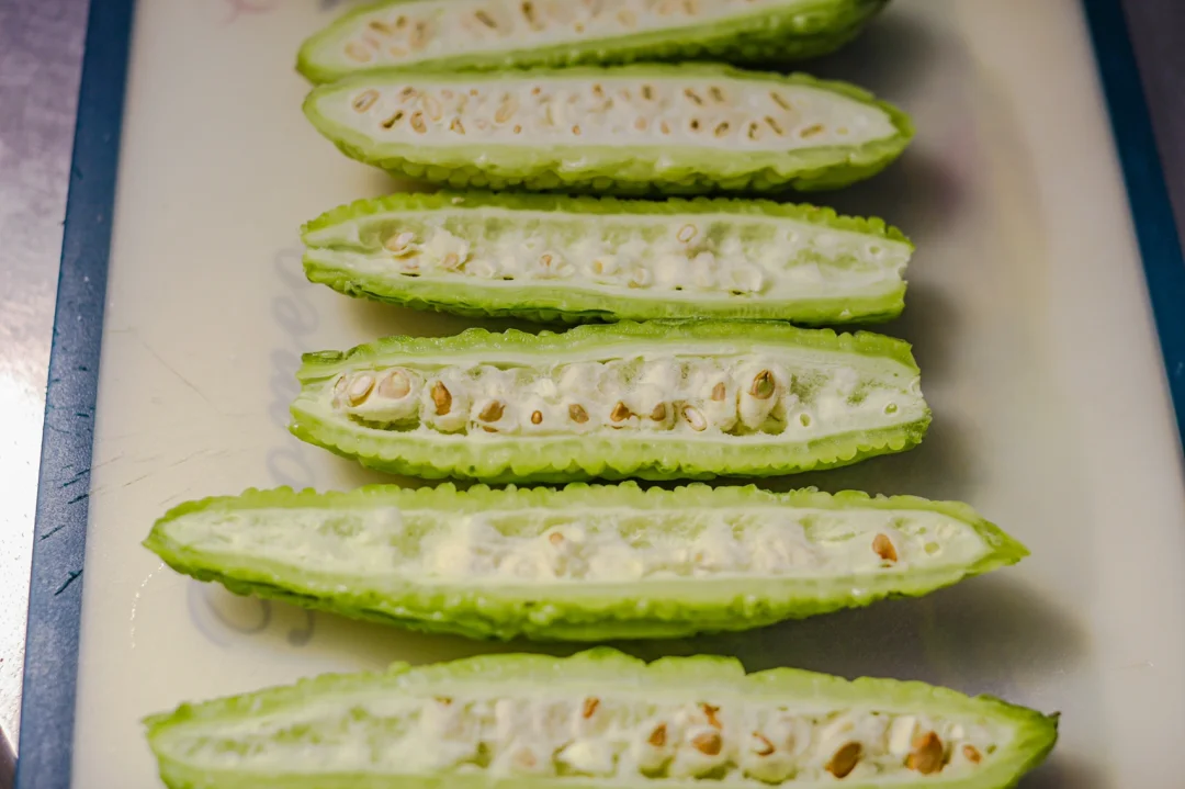 🌟1.苦瓜清洗干净,顺着长度切成两半,挖去苦瓜的内瓤。