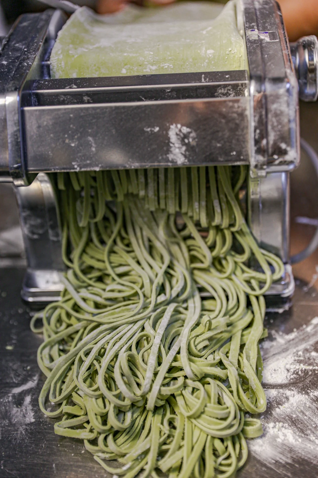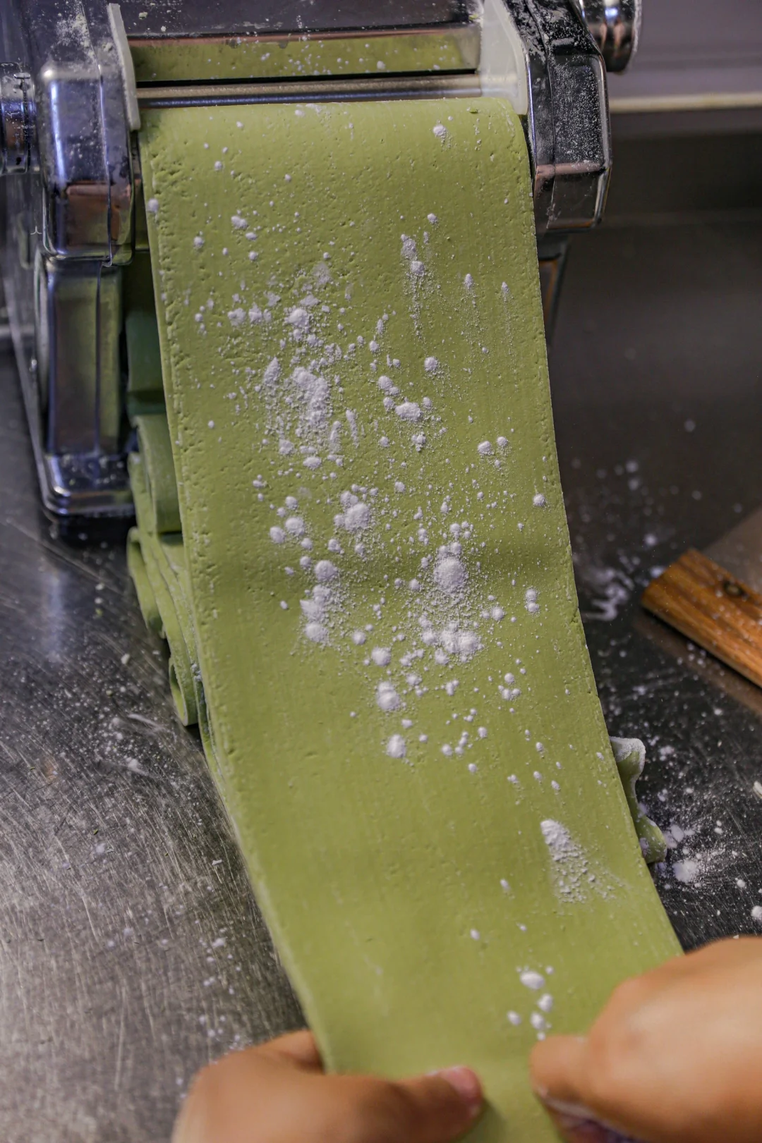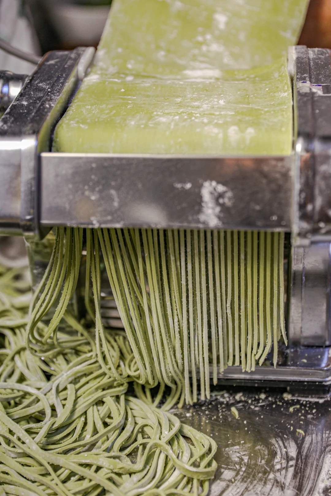 5️⃣:最后放入压面条的那个通道,根据喜好压成宽面或者细面就可以了。