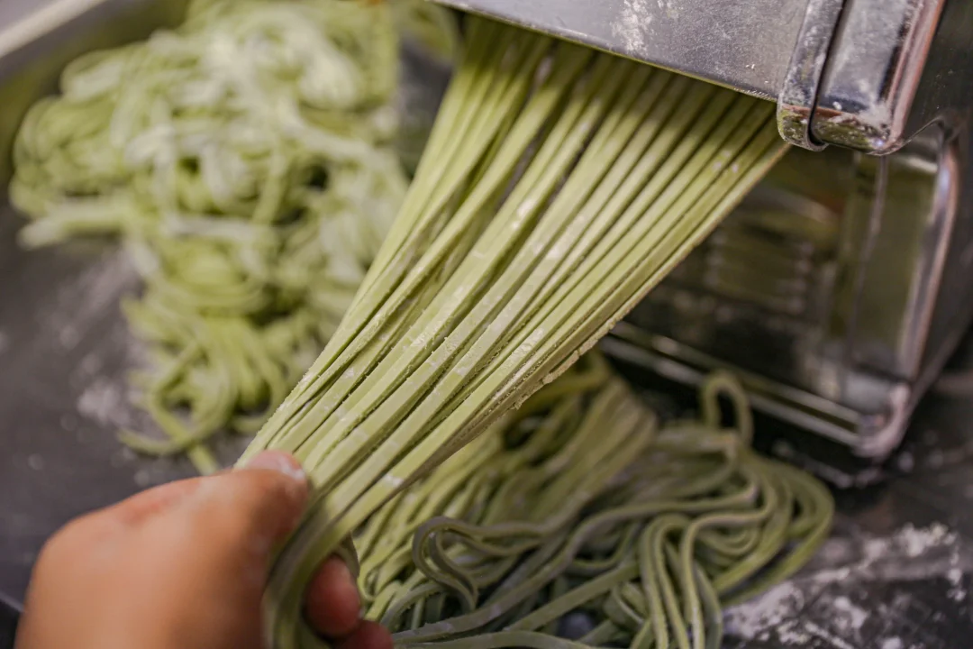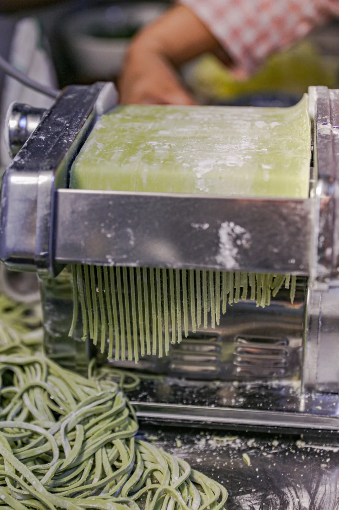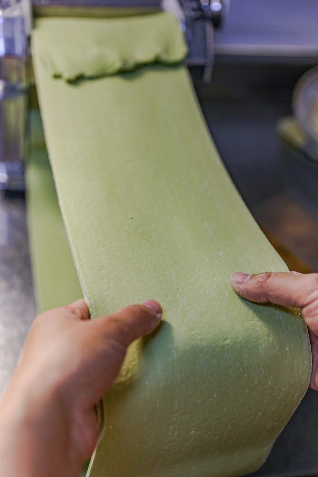 5️⃣:最后放入压面条的那个通道,根据喜好压成宽面或者细面就可以了。