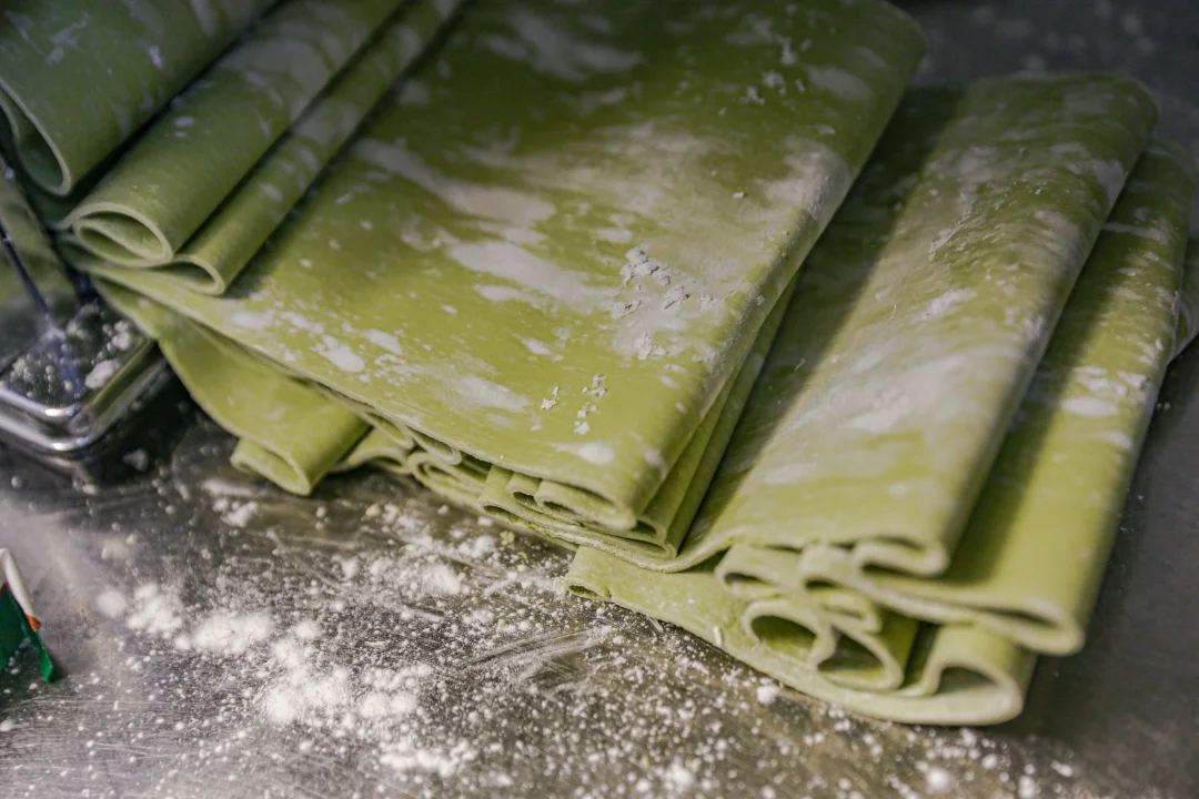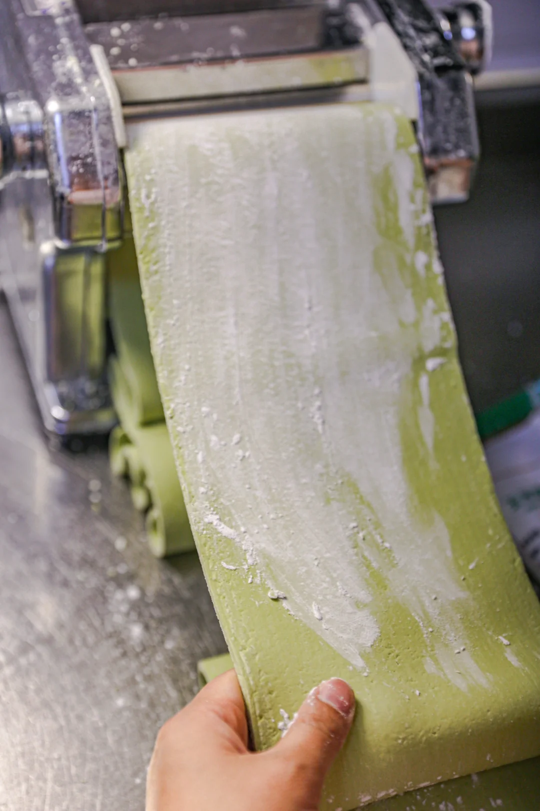 4️⃣:撒上一些玉米淀粉或者土豆淀粉做为补面,把面片从2档到4档压成稍微薄的片状。