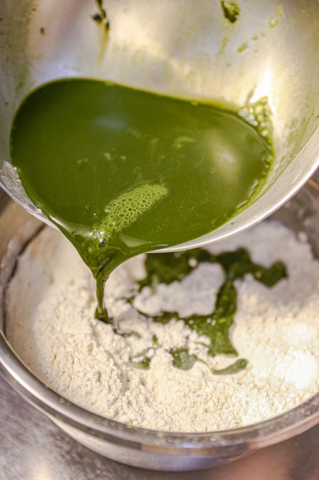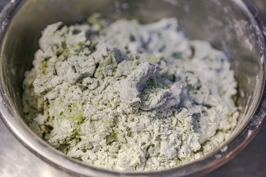 1️⃣:先把菠菜汁少量多次倒入面粉中,慢慢用手搓成颗粒状即可,也可以揉成面团,也可以不用。菠菜汁可以预留出10克-20克之间,因为不同的面粉吸收水的程度是不一样的,水量仅供参考。
