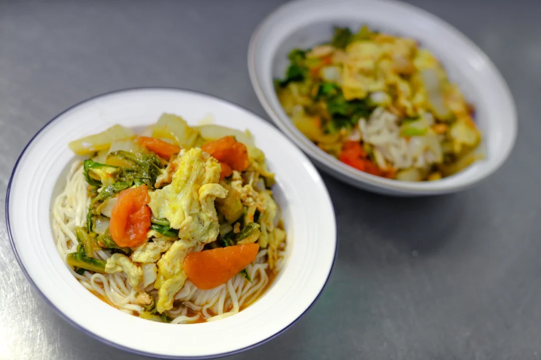 3.面条煮熟后放入碗中,加入炒好的白菜,少许的汤汁,搅拌均匀即可。