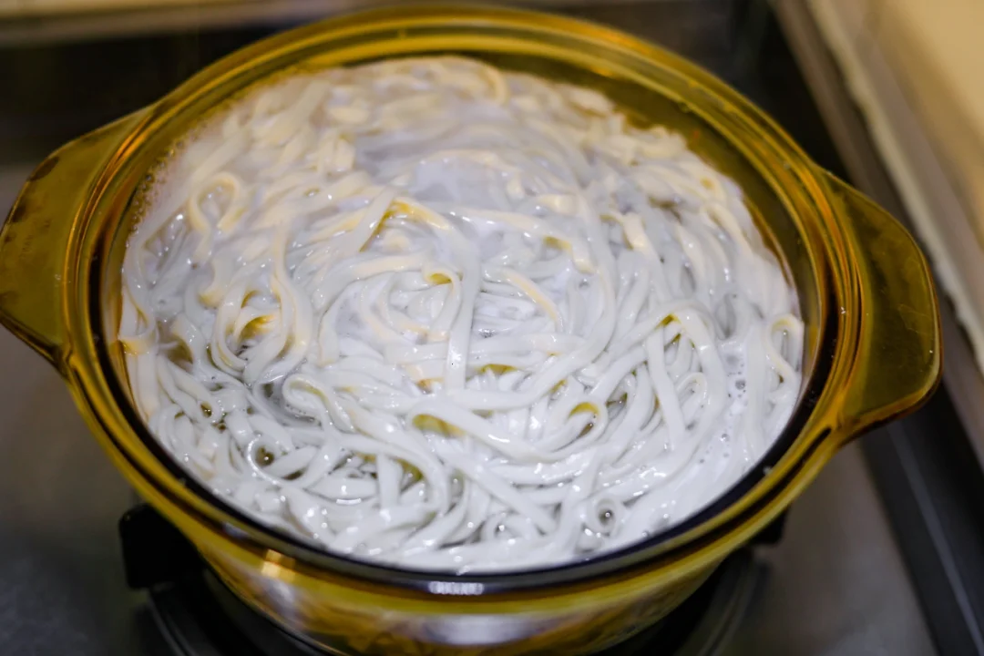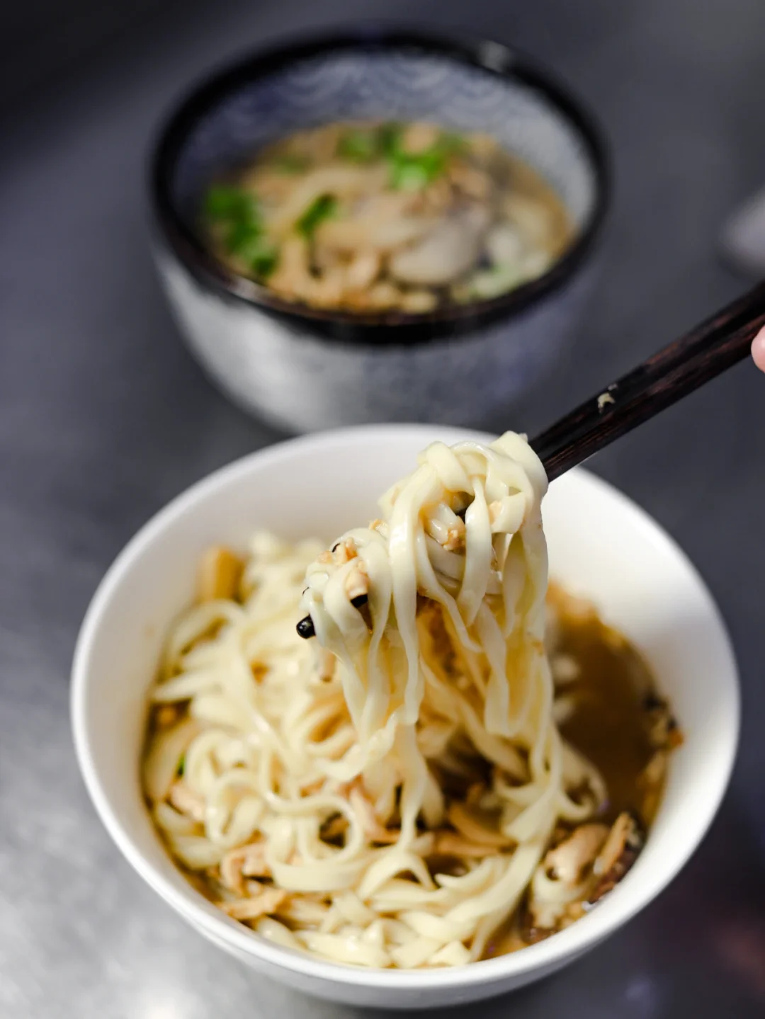 5.面条是自己在家压的鲜面条,可以用任何面条来代替。煮熟之后放入碗中,把煮好的香菇鸡丝汤浇在上面,撒上葱花,大功告成。