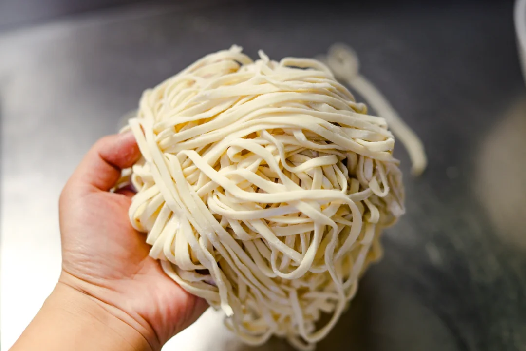 如果家里有压面机,面和水的比例是600克面粉,一个鸡蛋,180克水,2克食盐,和成絮状,反复压就可以。这个比例压出来超级劲道!