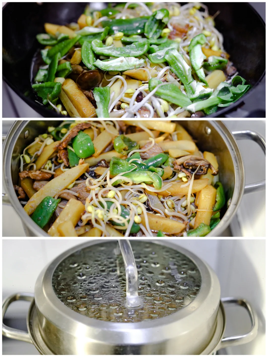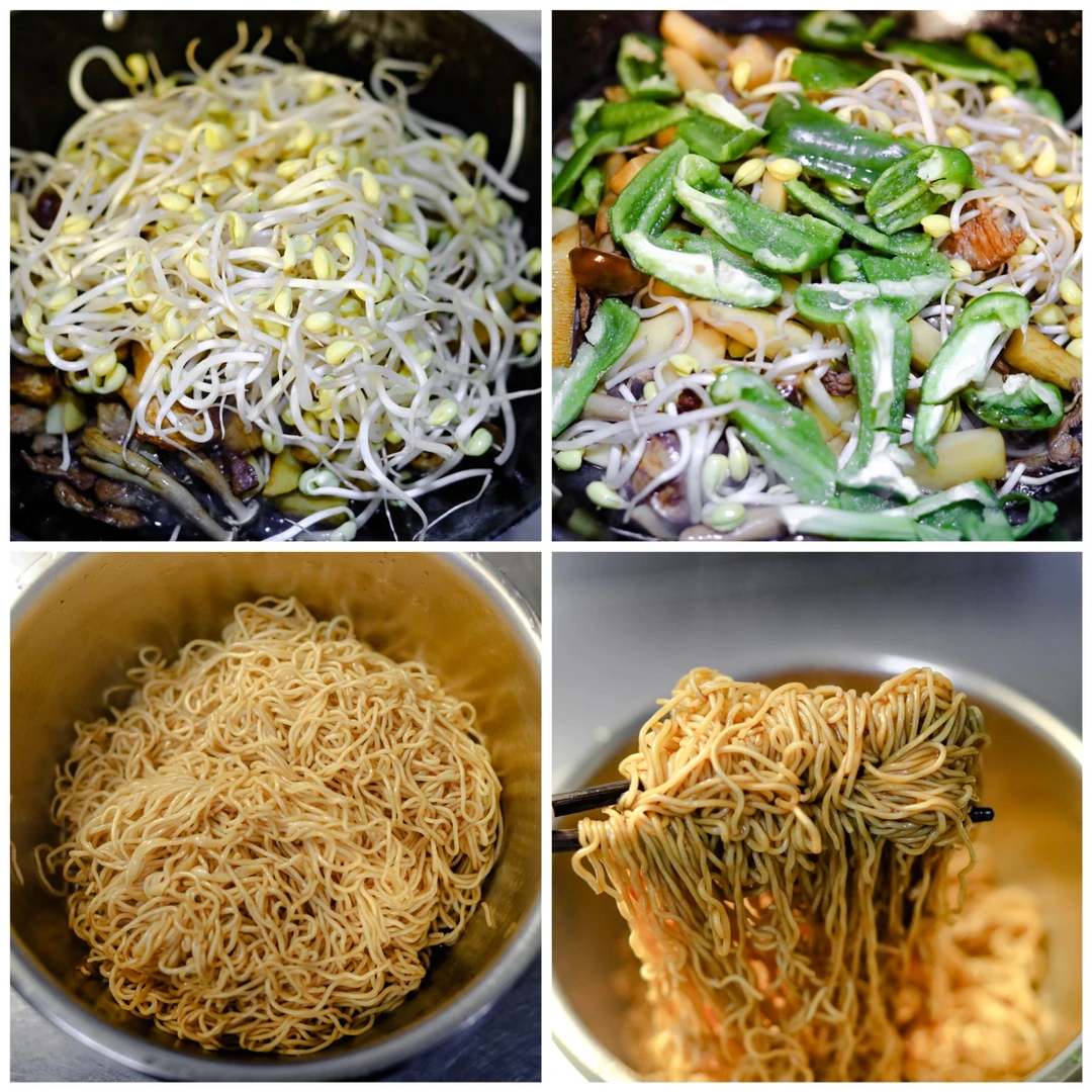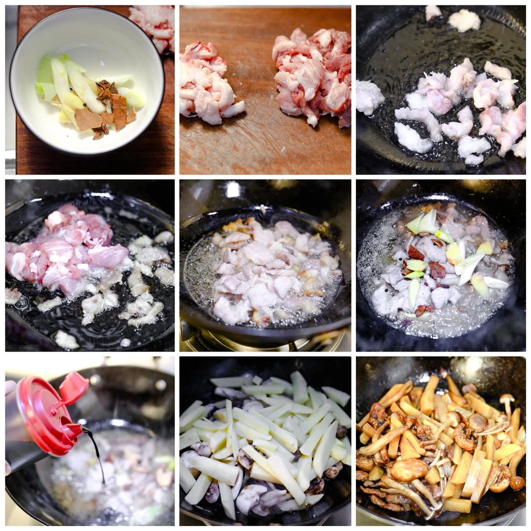 2.前腿肉肥瘦分开,切成薄片。锅烧很热的时候,加入食用油,把肥肉先放进去,炒到油脂出来,呈焦黄色的时候把瘦肉放进去,翻炒两下,放入黄酒去腥,加入葱姜,八角,桂皮,几个花椒粒,炒出香味之后,倒入老抽,可以稍微多一些,因为后边还要给面条增色,加入自己所喜欢的蔬菜(这次用的是豆芽,土豆,菇类,青椒以及绿叶菜),然后加生抽增鲜,少量食用盐,鸡粉,味精,加一点水烧开。