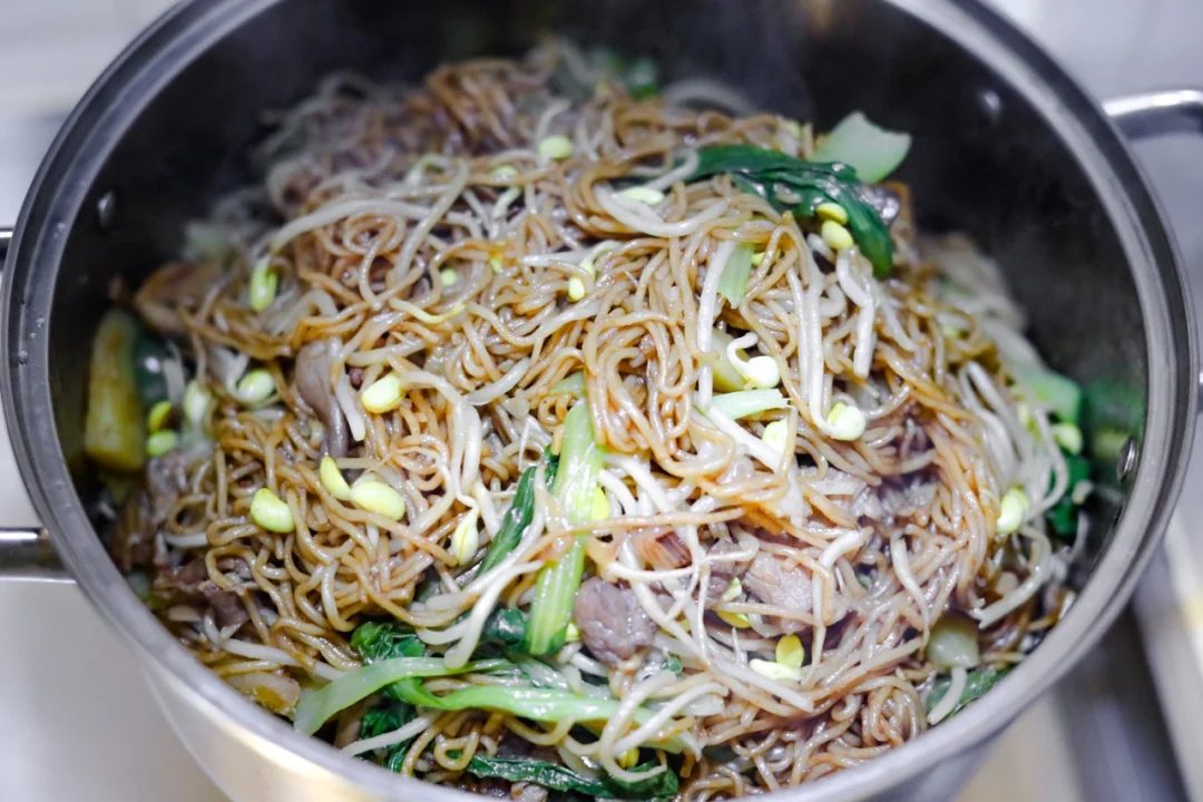 4.把之前蒸好的面条放入菜汤中,用筷子翻拌均匀,让面条把汤汁完全吸收干净即可。