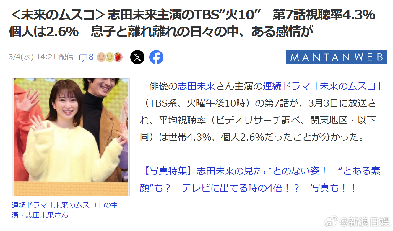 海外影视速递志田未来主演的1月期TBS火10剧《未来的儿子》第七集世代收视率4.3,个人收视率3.6。剧集改编阿相久美子和黑麦はぢめ的同名原作漫画,是一部描绘了梦想和工作都濒临危机的汐川未来(志田未来饰)身边突然出现了一个自称是“未来的儿子”而开始的超越时空的爱情故事。儿子飒太一角由在试镜选拔出的天野优扮演。