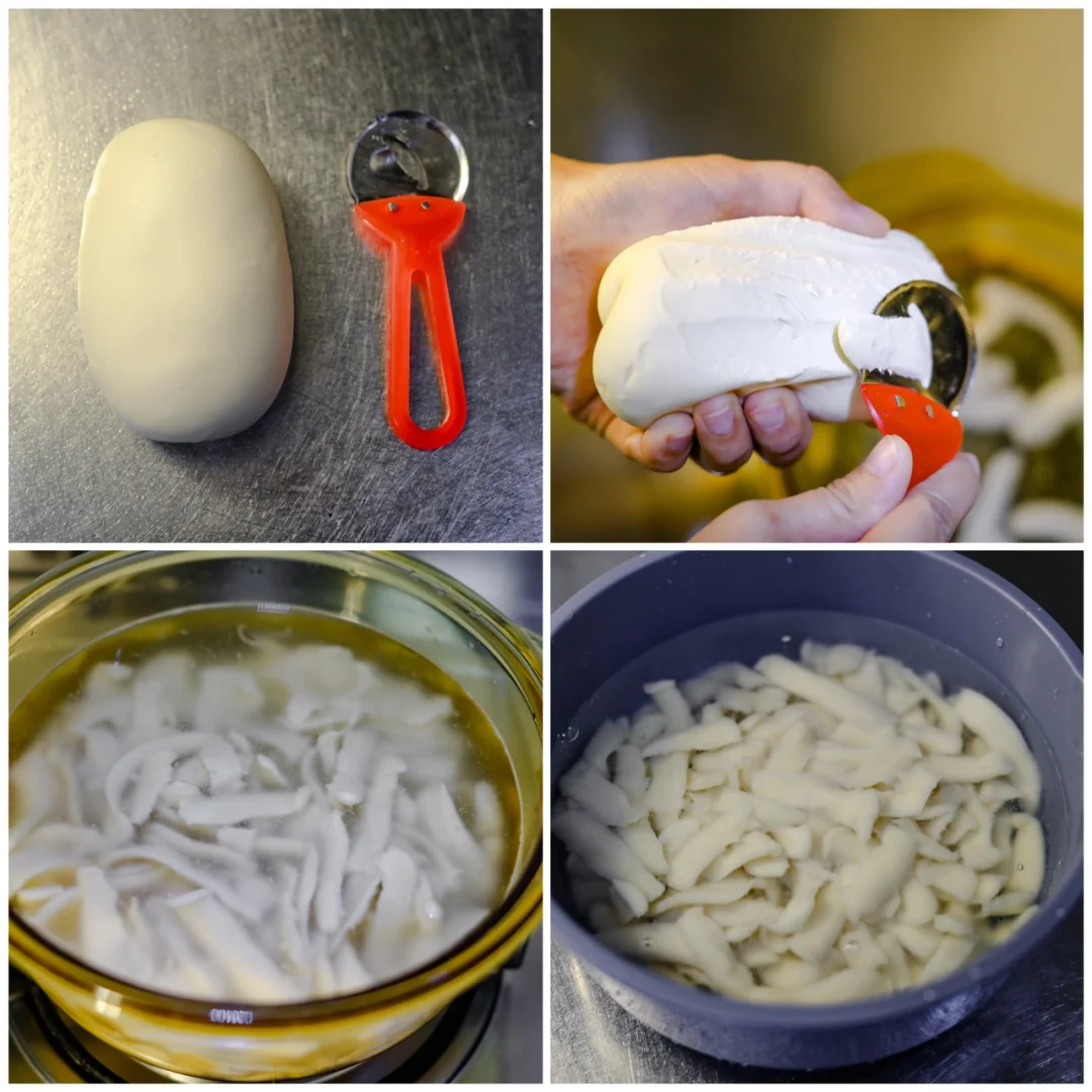 刀削面的比例是:500克中筋面粉,4或者4.5两的凉水,混合在一起之后,每隔半小时揉一次,大约反复2-3次,最后醒面30分钟,揉成非常光滑的面团就可以削面了。